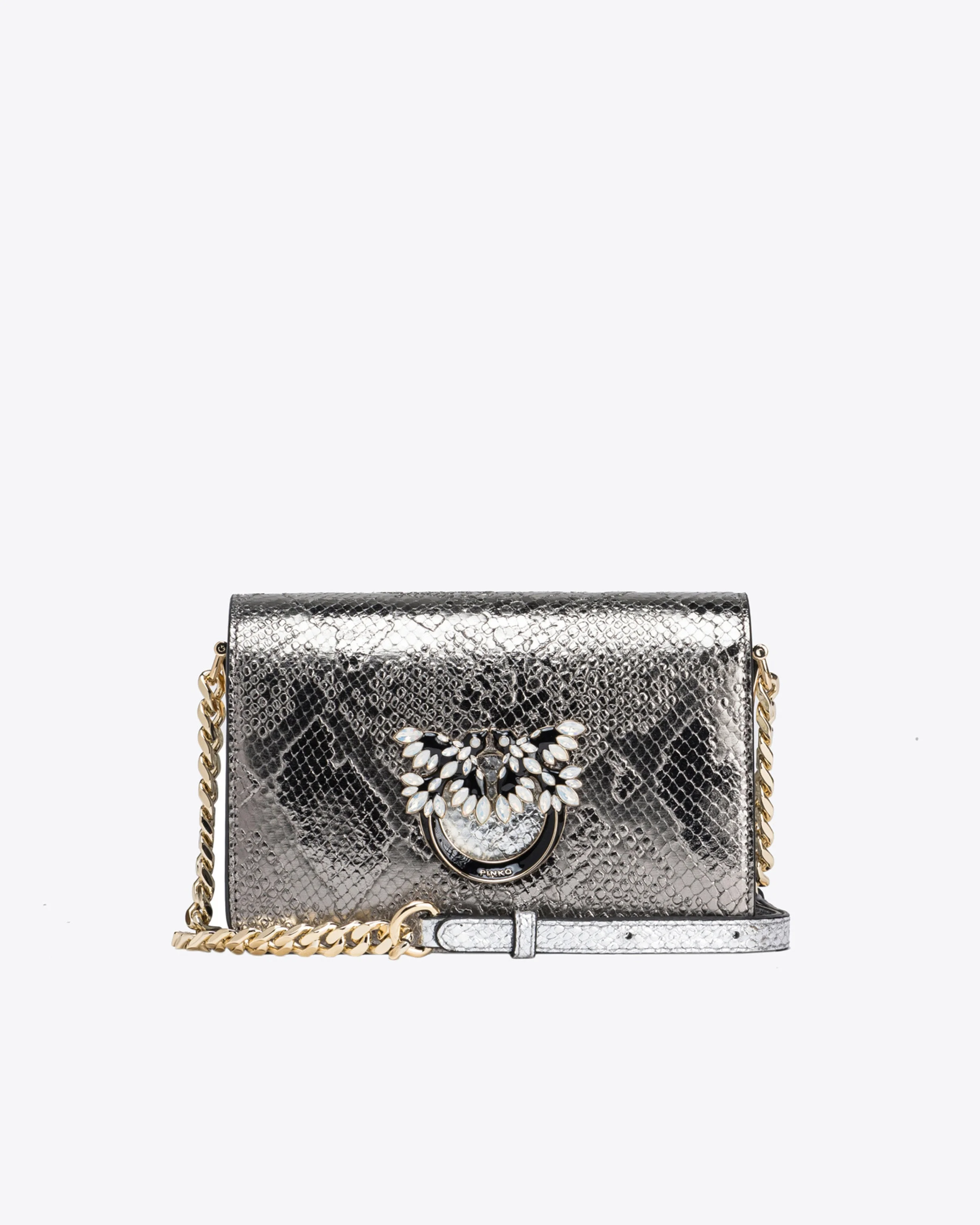 100067A1T5-IEHL Mini Love Bag Click in reptile-print leather with a punched and laminated dual fabric-like effect. Here, the slightly raised python-print leather contrasts with the laminated material used. The concealed press-stud fastening is enhanced by the iconic Love Birds Diamond Cut buckle—in light gold-electroplated metal with black enamel—featuring a cut-out effect and opalescent white stones. Inside, it features contrasting lining, a slip pocket and a zipped divider pocket. The shoulder strap combines the classic round-link chain with a practical, adjustable leather pad. The bag is part of the Limited Edition special capsule collection which comprises PINKO Galleria-exclusive limited-edition models. Use the special NFC chip to enjoy a special experience, specific to the bag you have just bagged! COMPOSITION Lining: VISCOSE 100% - Leather: CALF LEATHER 100% CALFSKIN LEATHER 100% - Leather: CALF LEATHER 100% CALFSKIN LEATHER 100% - Leather: CALF LEATHER 100% CALFSKIN LEATHER 100% MEASURES W: 0.73 g H: 12.5 cm W: 6.0 cm L: 19.0 cm