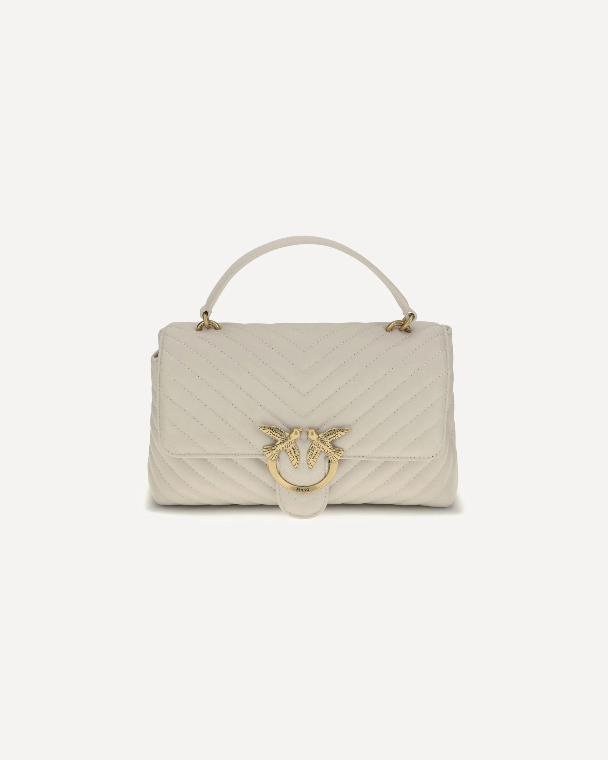 Calfskin Love Lady Handbag by Pinko, front magnetic button closure, iconic gold-plated and embossed Love Birds logo on front, quilted and padded design, double interior compartment, sliding chain shoulder strap, flat rigid handle at top, interior flat pocket with zipper, iconic tone-on-tone embroidered brand monogram on back. DETAILS - Sku: 100043A0GK_Z14Q - Season: AW25 - Dimension: 27x27x7 - Composition: GENERAL 100% Calf Leather Bos Taurus - MADE IN CHINA