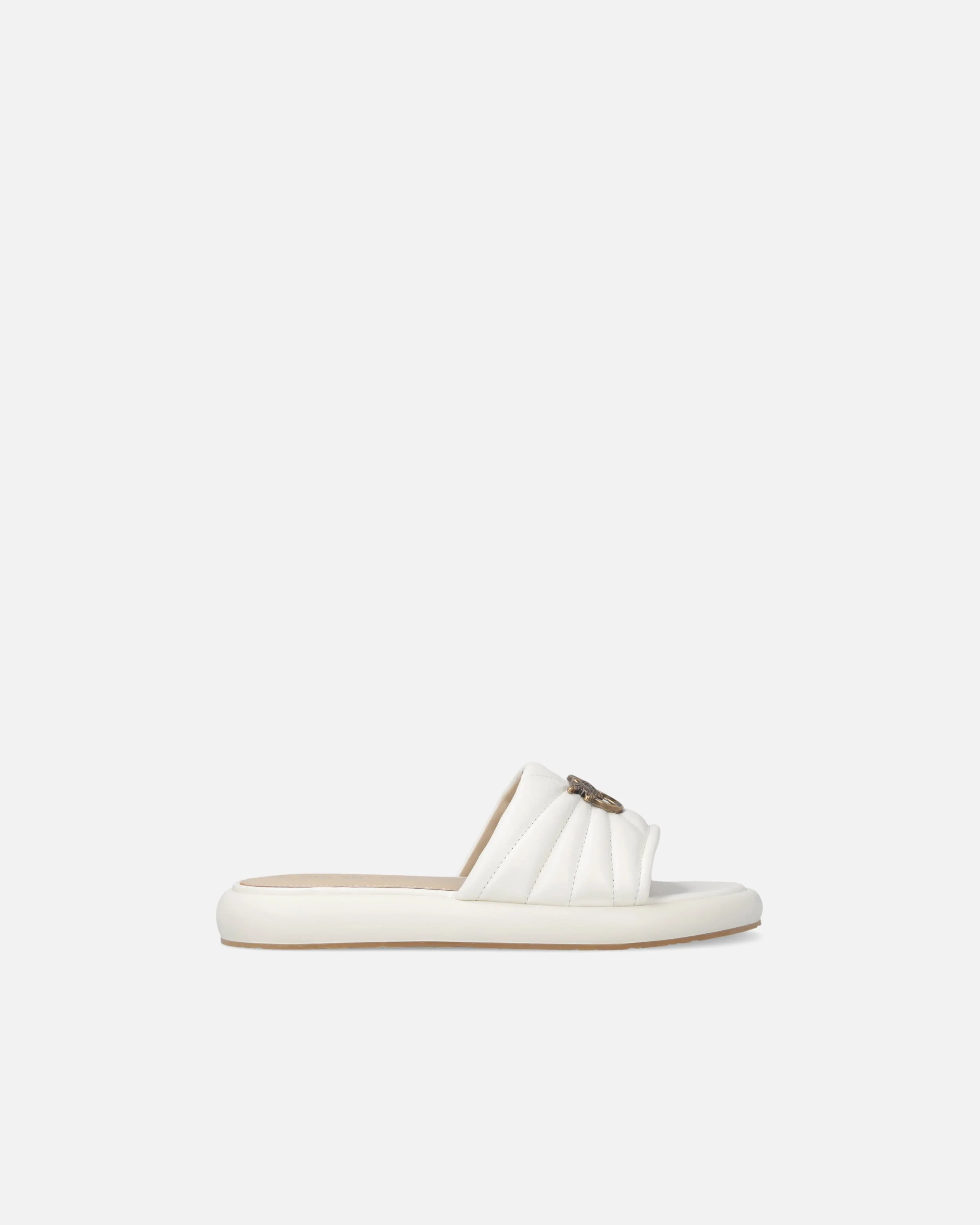SD0525P003-Z12 Slip-on sandals made of soft nappa leather, featuring a thick padded and quilted upper band with a metal plaque in the centre depicting the iconic Love Birds Diamond Cut logo, the emblem of the PINKO DNA. The design has an ergonomic rubber sole with a chunky yet balanced profile, and is complete with a leather insole for greater comfort when worn. A reinterpretation of the classic slip-on sandal in an urban and contemporary version, the model is also perfect for completing your city looks. - FIONA 03 COMPOSITION Lining: CALF LEATHER 100% CALFSKIN LEATHER 100% - Upper: SHEEP LEATHER 100% SHEEPSKIN LEATHER 100% - Sole: CALF LEATHER 100% CALFSKIN LEATHER 100% - Sole: ELASTODIENE 100% RUBBER 100% MEASURES W: 0.95 g