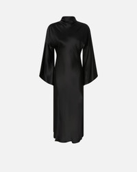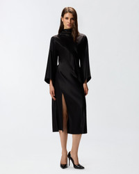 105730A1Y5-Z99 Long fitted satin dress with a high neck and long full sleeves. The shiny satin gives the piece unique shimmer and a particularly soft hand. The side slit and the cut-out detail on the back will enhance your sensuality without sacrificing class. Wear this dress for a fluid, slinky effect that elegantly enhances the lines with sophistication and the feminine silhouette. COMPOSITION Outside Fabric: ACETATE 91% POLYESTER 9% MEASURES W: 0.43 g