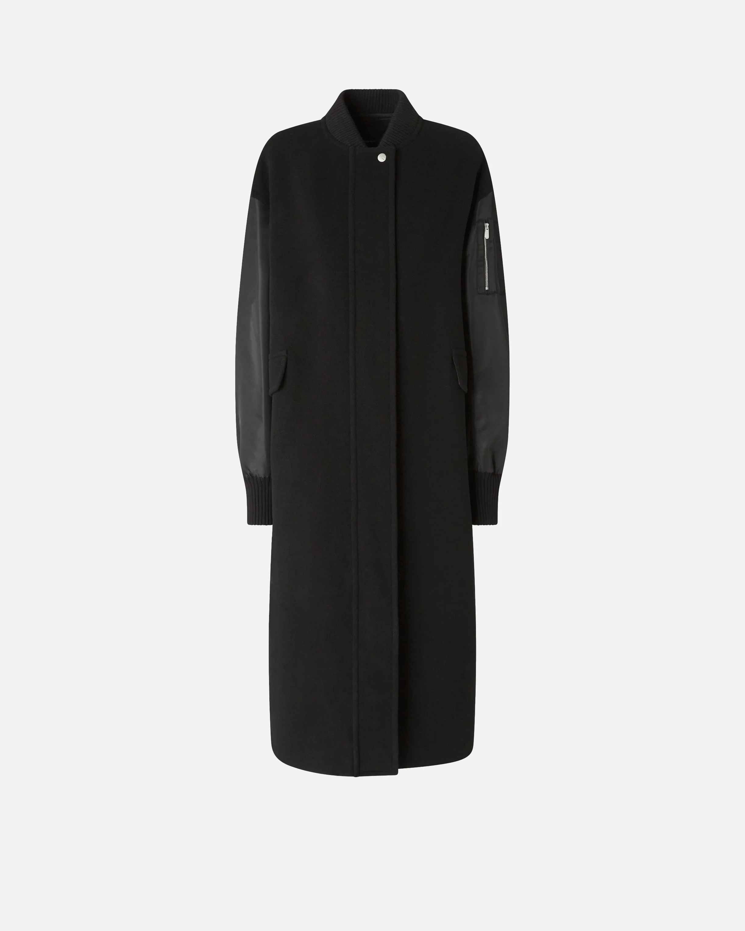 MAPUR COAT − 105640A2SLZ99 Long lined coat with a bomber collar, flap pockets and zipped pocket on one sleeve. The style is made from warm, soft wool-blend cloth with long technical satin sleeves. Ribbed neck and cuffs. Concealed fastening with only the first button visible. This outerwear is ideal for wearing on cooler early-season days in the open air with maximum comfort without sacrificing a touch of style. COMPOSITION 1° Outside Fabric: WOOL 78% POLYAMIDE 22% POLYAMMIDE 22% - 2° Outside Fabric: POLYAMMIDE 100% POLYAMIDE 100% - Lining: ACETATE 67% POLYESTER 33% - Padding: POLYESTER 100% - Neck: ACRYLIC 45% WOOL 45% POLYAMMIDE 6% POLYAMIDE 6% ELASTANE 4% - Cuff: ACRYLIC 45% WOOL 45% POLYAMMIDE 6% POLYAMIDE 6% ELASTANE 4%