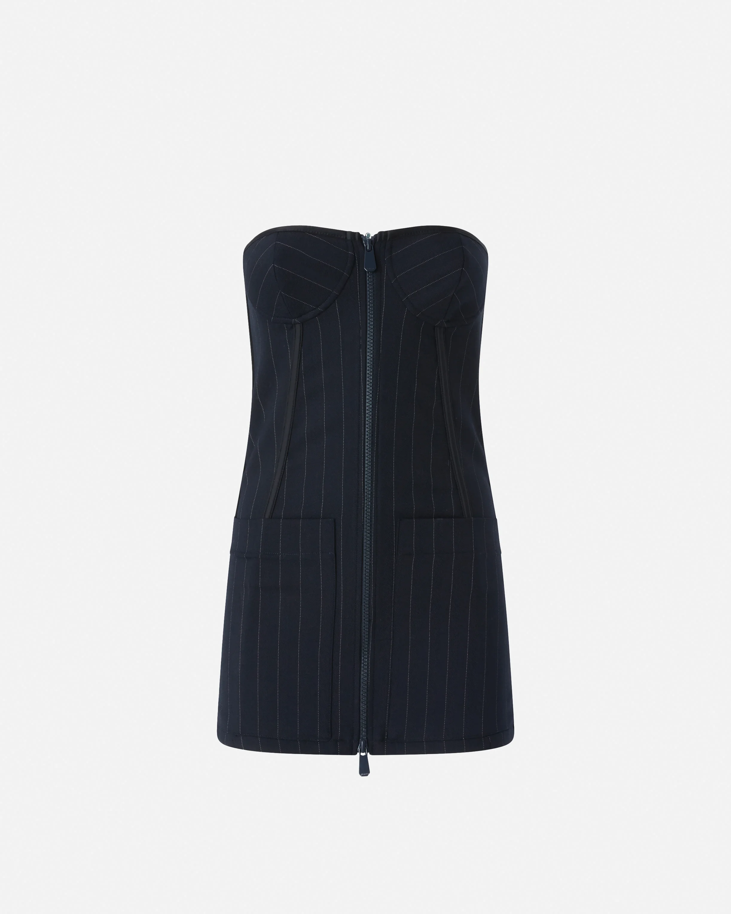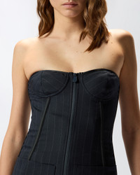 BUDINO BUSTIER − 105631A2QYEZ1 Structured top with pockets on the hem and full-length two-way zip fastening on the front. The fabric used is a classic pinstripe in a poly-wool blend distinguished by a change of weave and shimmer to underline the design of the material. Slight sweetheart neck with pre-formed cups. The garment is inspired by a vintage piece, is entirely supported by external boning that creates graphic lines in contrast with the pinstripe fabric and is lined with stretch bodice fabric. COMPOSITION 1° Outside Fabric: POLYESTER 54% WOOL 44% ELASTANE 2% - 2° Outside Fabric: POLYESTER 90% ELASTANE 10% - Lining: ACETATE 55% POLYESTER 45% - Padding: POLYESTER 100% - Accessory 1: POLYAMMIDE 100% POLYAMIDE 100% - Accessory 2: POLYAMIDE 63% POLYAMMIDE 63% ELASTANE 37% - Accessory 3: POLYAMIDE 80% POLYAMMIDE 80% ELASTANE 20%