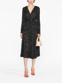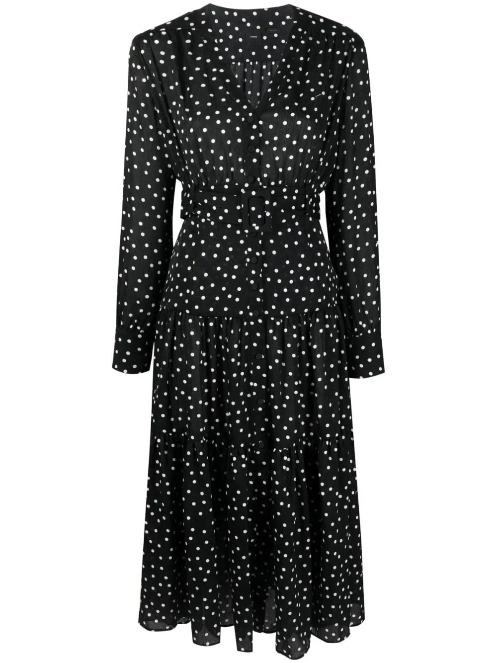 polka-dot-print belted midi dress Playing host to an all-over polka-dot print, PINKO's midi dress is emblematic of the brand's ability to infuse garments with its signature charm. The piece is cut to a V-neck silhouette and enhanced with a matching belt at the waist. Highlights - Black/white - Polka dot print - Belted waist - Front button fastening - V-neck - Long sleeves - Below-knee length - Straight hem Imported Composition Polyester 100%