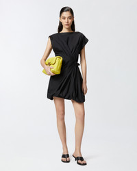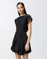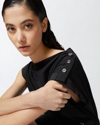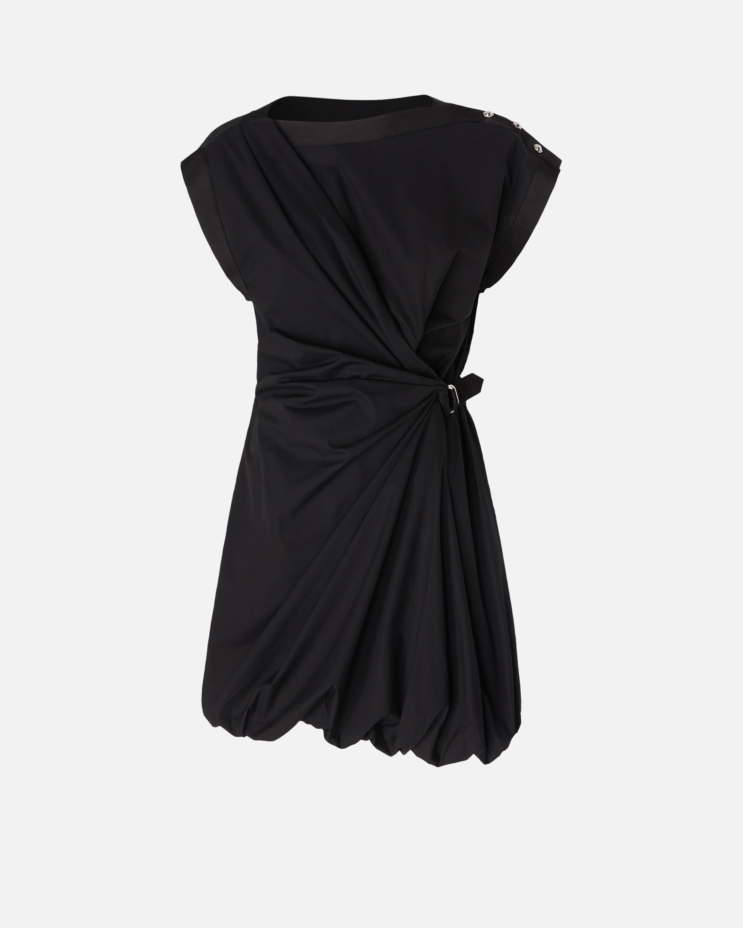 ELLIOT DRESS − 105215A2LDZ99 Women's sleeveless short dress in lightweight 100% cotton poplin, perfect for summer occasions. The dress is characterized by a straight neckline and asymmetrical armholes: one of the two, in fact, is slightly more elongated in cap sleeve style and personalized with a row of metal buttons on the shoulder. The front of the dress features a crisscross pattern, held at the side with a strap, creating a pattern of pleats and draping. The poplin dress has a regular fit, narrower at the waist with elastic at the back, with a balloon miniskirt. The invisible side zip helps and facilitates wearing. This short balloon dress is perfect for both everyday occasions and special events, depending on the accessories you decide to combine with it. COMPOSITION 1° Outside Fabric: COTTON 100% - 2° Outside Fabric: POLYESTER 100% - Lining: COTTON 100%