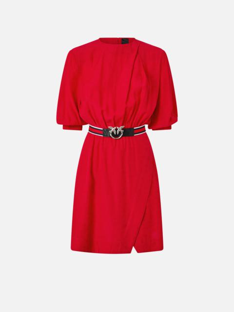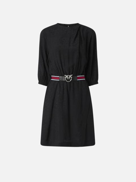 SURIMI DRESS − 105430A2PXRA1 Short crew-neck dress with three-quarter sleeves finished with gathered detailing, a wrap skirt and a contrasting belt with Love Birds buckle. The garment is made from viscose jacquard and the texture is customised with a Love Birds logo motif. This fitted style is more cinched on the sides. Button fastening and keyhole cut-out at the back. Wear it every day to get practicality, romance and femininity in one piece that can be worn from the office to after-work drinks. COMPOSITION Outside Fabric: VISCOSE 100% - coating: POLYURETHANE 100% - Lining: VISCOSE 100% - Accessory 1: POLYESTER 70% ELASTANE 30% - Accessory 2: POLYESTER 100%