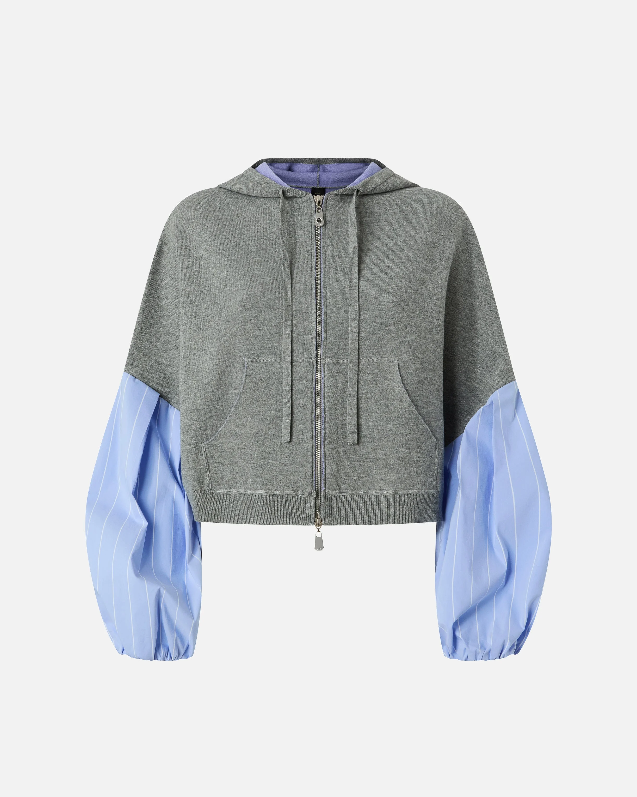 106289A348-IE3 Vanise-knit viscose-blend sweatshirt with contrasting shirt-style insert in striped stretch cotton-blend poplin that complements the sleeves and gives them a balloon-like shape. This model features elasticated sleeve ends, pouch pockets, two-way zip fastening at the front and a drawstring hood finished with a label sporting the iconic PINKO logo on the back. A garment that demonstrates the refined creativity of the brand, ideal for modern looks that combine functionality and style. COMPOSITION Outside Fabric: COTTON 67% POLYAMMIDE 28% POLYAMIDE 28% ELASTANE 5% - Outer Yarn: VISCOSE 70% POLYESTER 30%