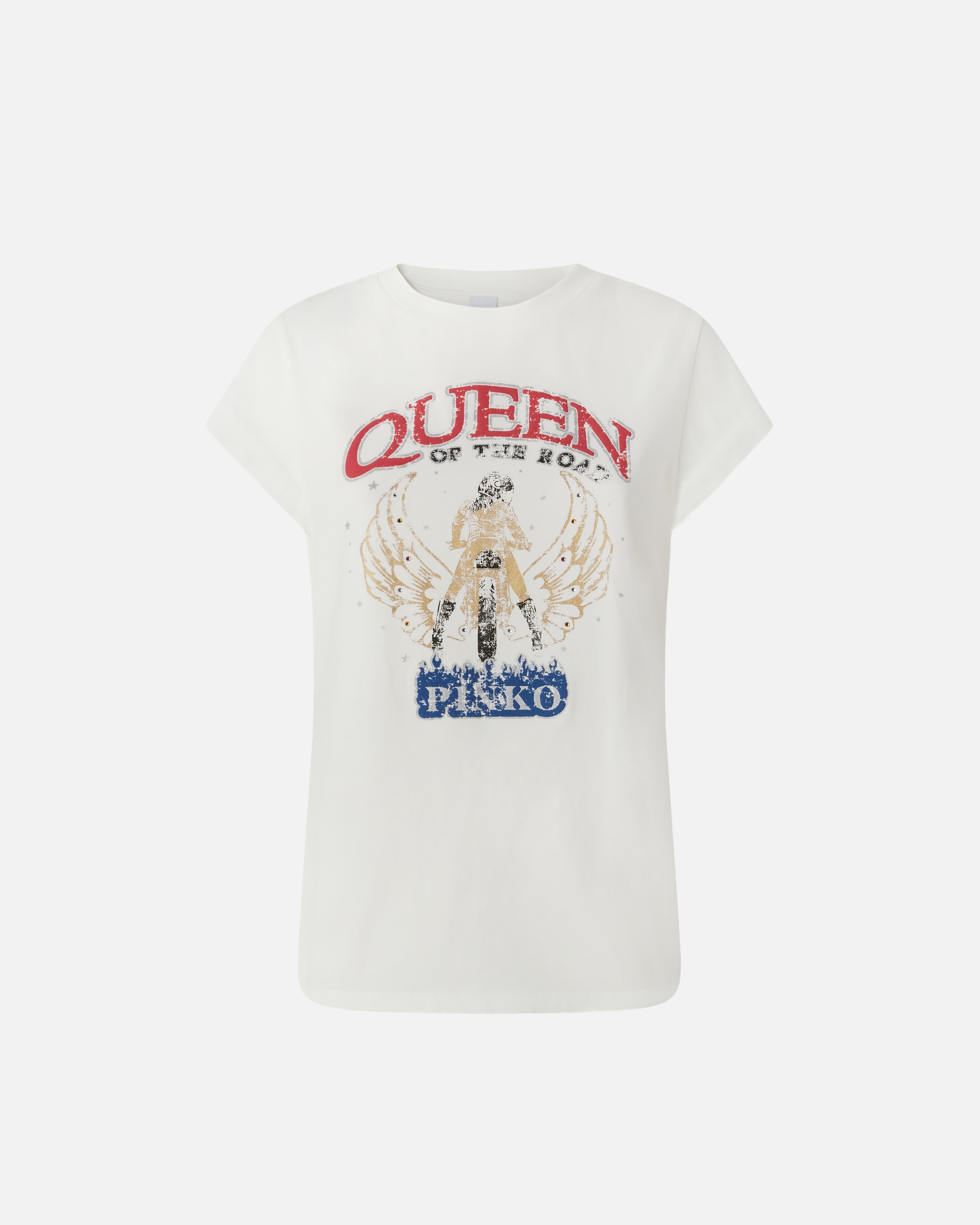 MARRAKECH T-SHIRT − 104603A2DAZ05 Short-sleeved T-shirt in garment-dyed cotton jersey with an old effect, personalized with a biker print on the center front completed with "Queen of the Road" lettering and glitter application to add an iconic shiny touch. The slim-fit silhouette and short cap sleeves make the t-shirt a perfect garment to wear to customize your everyday looks with a bold and ironic touch. COMPOSITION 1° Outside Fabric: COTTON 100% - 2° Outside Fabric: COTTON 100% - : Glass 100%