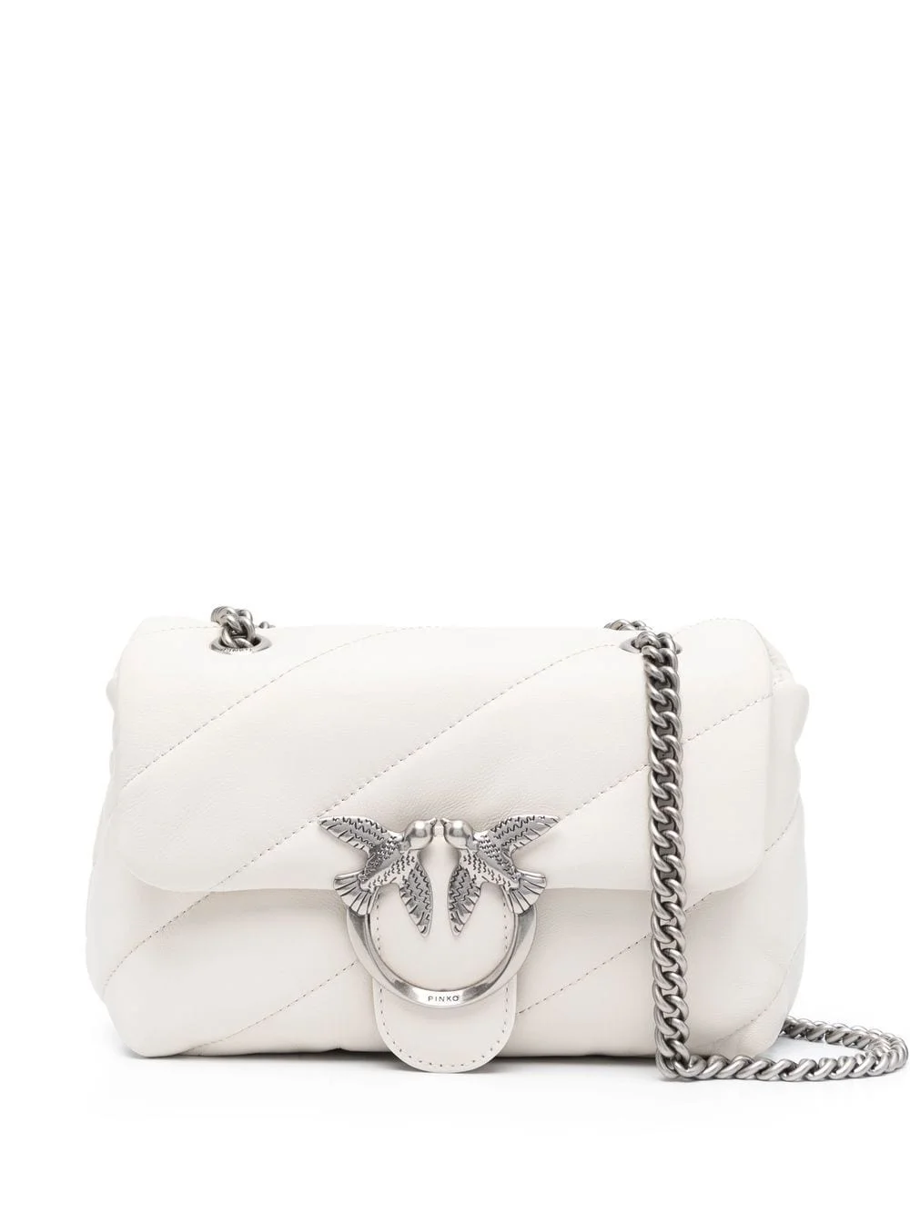 quilted sheepskin shoulder bag white sheepskin quilted finish signature Love Birds buckle silver-tone hardware foldover top with magnetic fastening chain-link shoulder strap Imported Composition Outer: Sheepskin 100% SIZE & FIT Model measurements Height 5 ft 10 in(1.77 m) Bust/Chest 35.03 in(89 cm) Hips 35.03 in(89 cm) Waist 23.62 in(60 cm) Measurement DEPTH 3.93 in(10 cm) HANDLE 11.41 in(29 cm) HEIGHT 5.51 in(14 cm) STRAP 21.65 in(55 cm) WIDTH 8.26 in(21 cm)