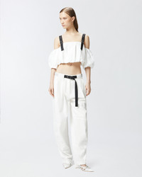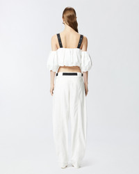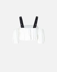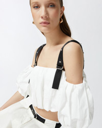 RAUL TOP − 105176A2LDZZ1 A short top with balloon volume made of lightweight pure cotton poplin, featuring a straight off-shoulder neckline that leaves the shoulders bare for a feminine detail. The sensual neckline is completed by balloon half-sleeves and adjustable straps in contrasting technical fabric with small metal studs applied. The off-the-shoulder top builds everyday looks with a special taste, worn with matching trousers for a total look that does not go unnoticed. COMPOSITION 1° Outside Fabric: COTTON 100% - 2° Outside Fabric: POLYESTER 100% - Lining: COTTON 100% - : Zinc 100%