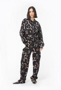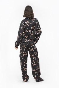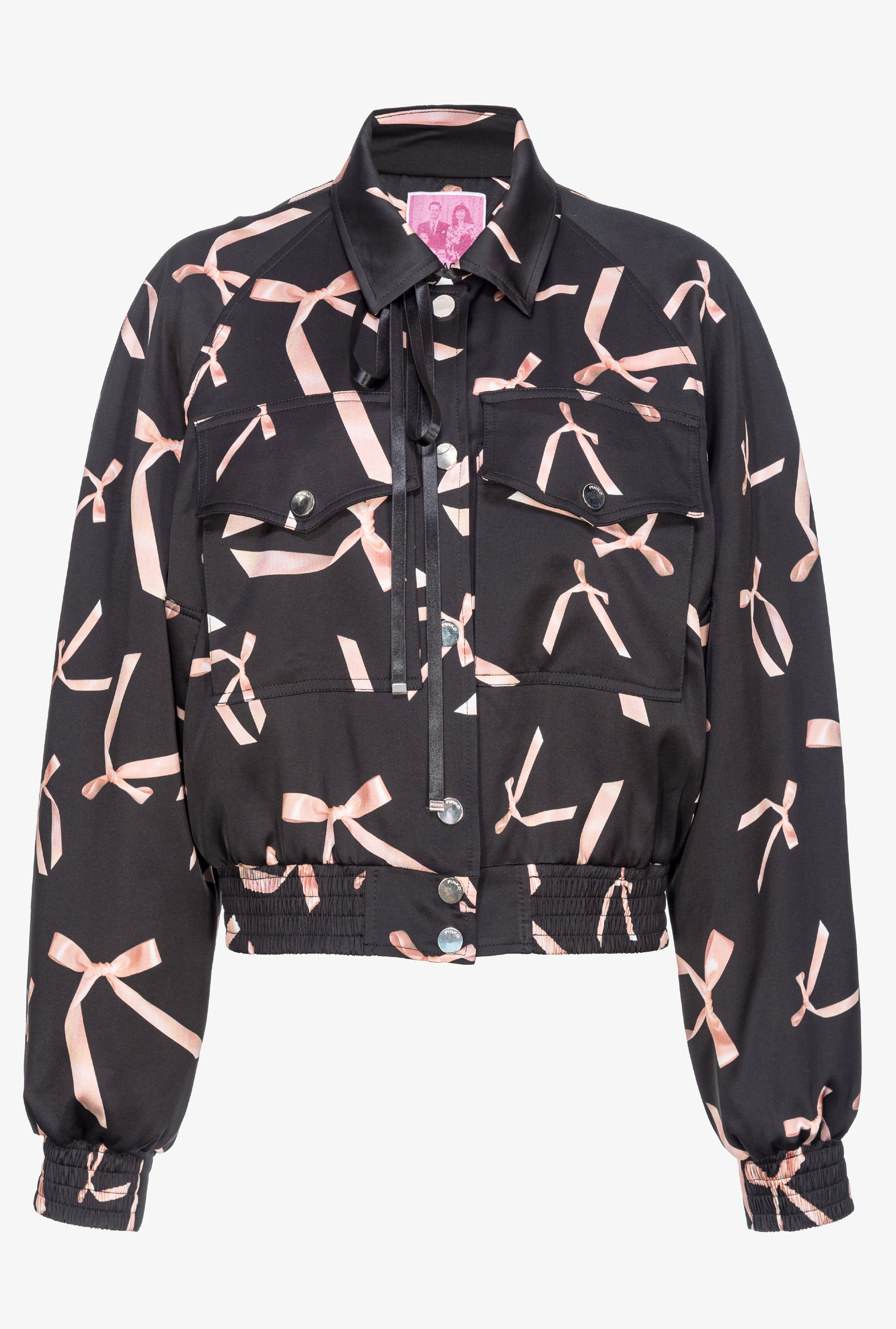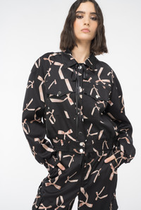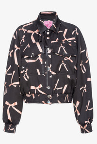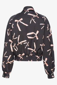 Bomber jacket with bow print all over, made from stretch viscose satin whose fibres come from responsibly managed forests. Pointed collar with matching-colour ribbon, long raglan sleeves with elastic cuff and small front pockets with pointed flap. Lined with bow print-embellished fabric. The lightweight padding contains recycled fibres. Press-stud fastening at the front. The piece is part of the PINKO Reimagine Spring/Summer 2024 capsule collection, created in collaboration with creative designer Patrick McDowell. View images for traceability details. COMPOSITION Outside Fabric: VISCOSE 97% ELASTANE 3% - Lining: POLYESTER 100% - Material 2: POLYPROPYL 100% POLYPROPYLENE 100% - Padding: POLYESTER 100% - Lining: ACETATE 64% POLYESTER 36% - Material 1: POLYESTER 100%