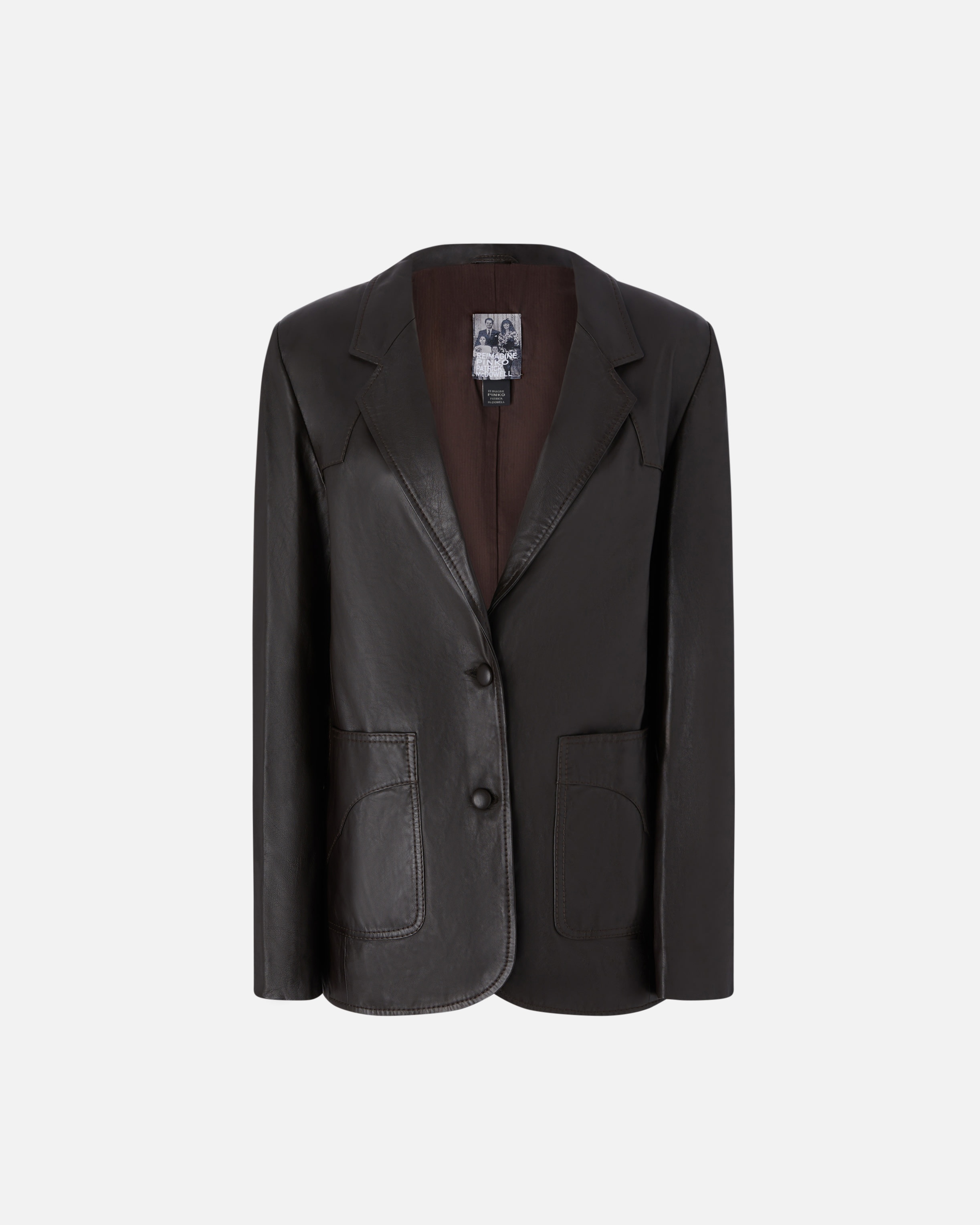 HACK JACKET − 105090A2JNM21 Single-breasted jacket in chrome-free, vegetable-tanned leather. Sporting a unique vintage silhouette, this jacket features a lapel collar and patch pockets with embroidery. The buttons for the single-breasted closure are covered in leather, while the inner fabric lining makes the garment more comfortable. The quintessential elegant garment, this blazer is bold, original and perfect for everyday wear. This item is part of the special PINKO Reimagine capsule collection for Spring/Summer 2025, created in collaboration with designer Patrick McDowell, who has always paid close attention to the choice of materials used in his collections to minimise their overall environmental impact. COMPOSITION Leather: SHEEP LEATHER 100% SHEEPSKIN LEATHER 100% - : COTTON 100% - : POLYESTER 100%