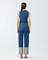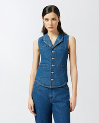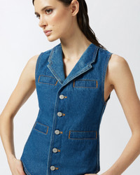 GALICENO GILET ā 105072A2JWPJL Sleeveless waistcoat in dark blue rinse-wash cotton denim, featuring contrasting-colour topstitching that evokes the detailing of iconic denim jackets. This fitted waistcoat features a small V-neck with lapels, four welt pockets at the front and metal tack-button fastening typical of denim wear. Brighten up your daytime look by pairing this denim waistcoat with optical white wide-leg trousers. This item is part of the special PINKO Reimagine capsule collection for Spring/Summer 2025, created in collaboration with designer Patrick McDowell, who has always paid close attention to the choice of materials used in his collections to minimise their overall environmental impact. COMPOSITION Outside Fabric: COTTON 100% - Lining: POLYESTER 65% COTTON 35%