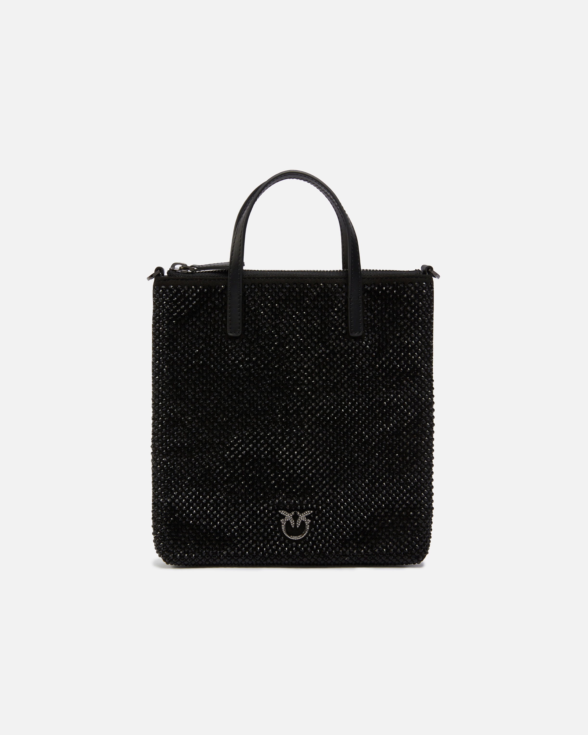 MINI SHOPPER − 102746A218Z99N00001 Shopping bag in smooth leather embellished with jewel-effect rhinestones all over and customised with a metal Love Birds Diamond Cut logo plaque with pave-set rhinestones. This small shopping bag is the ideal accessory for special-occasion looks and can be carried either by hand thanks to its two top handles, or crossbody thanks to the matching, small clasp-detachable leather shoulder strap. The bag's interior is lined with polycotton and it fastens with a zip at the top. Activate your PINKO bag: verify the authenticity of your product and access a personalised experience by scanning the Love Birds embroidery on the back of the bag with your smartphone! COMPOSITION Outside Fabric: POLYAMMIDE 50% POLYAMIDE 50% POLYURETHANE 50% - Lining: POLYESTER 100% - Leather: COWHIDE 100% BOVINE SKIN 100% - : Silica 100% SILICON DIOXIDE 100% - : Aluminium 50% aluminium 50% Zamak 50% Zinc Alloy 50% MEASUREMENTS - Height: 29 cm - Width: 3 cm - Length: 22 cm