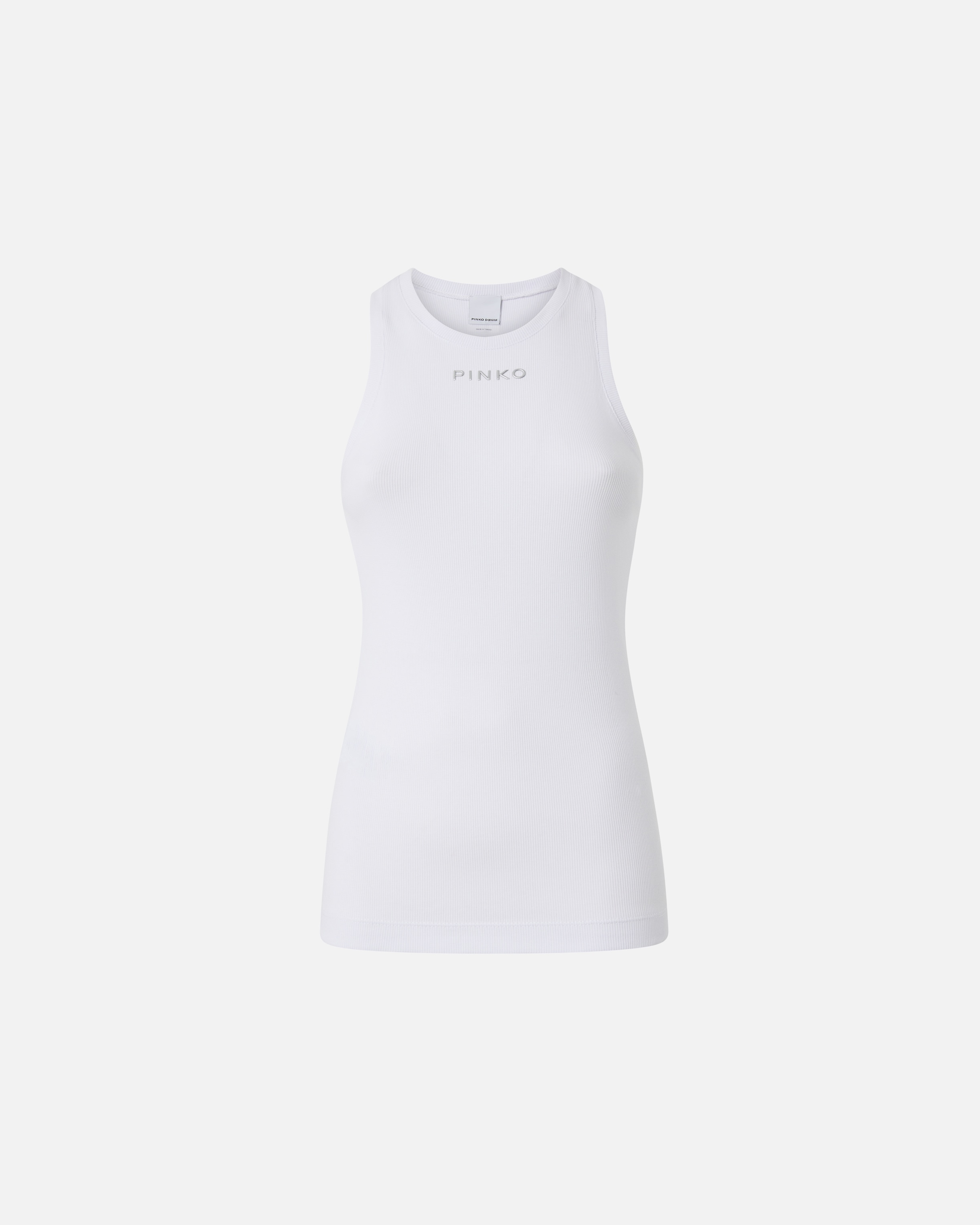 DISTINTO CANOTTIERA ā 100822A2C1Z04 Sleeveless fitted top with tank top silhouette with racer neckline on the back in ribbed stretch cotton knit, personalized with mini PINKO logo applied in front center. A versatile top that knows how to adapt to all occasions and is always up to the situation: combine it with a pair of jeans and a jacket, but also with your favorite jumpsuit to stay comfortable, but with style. COMPOSITION Outside Fabric: COTTON 97% ELASTANE 3%
