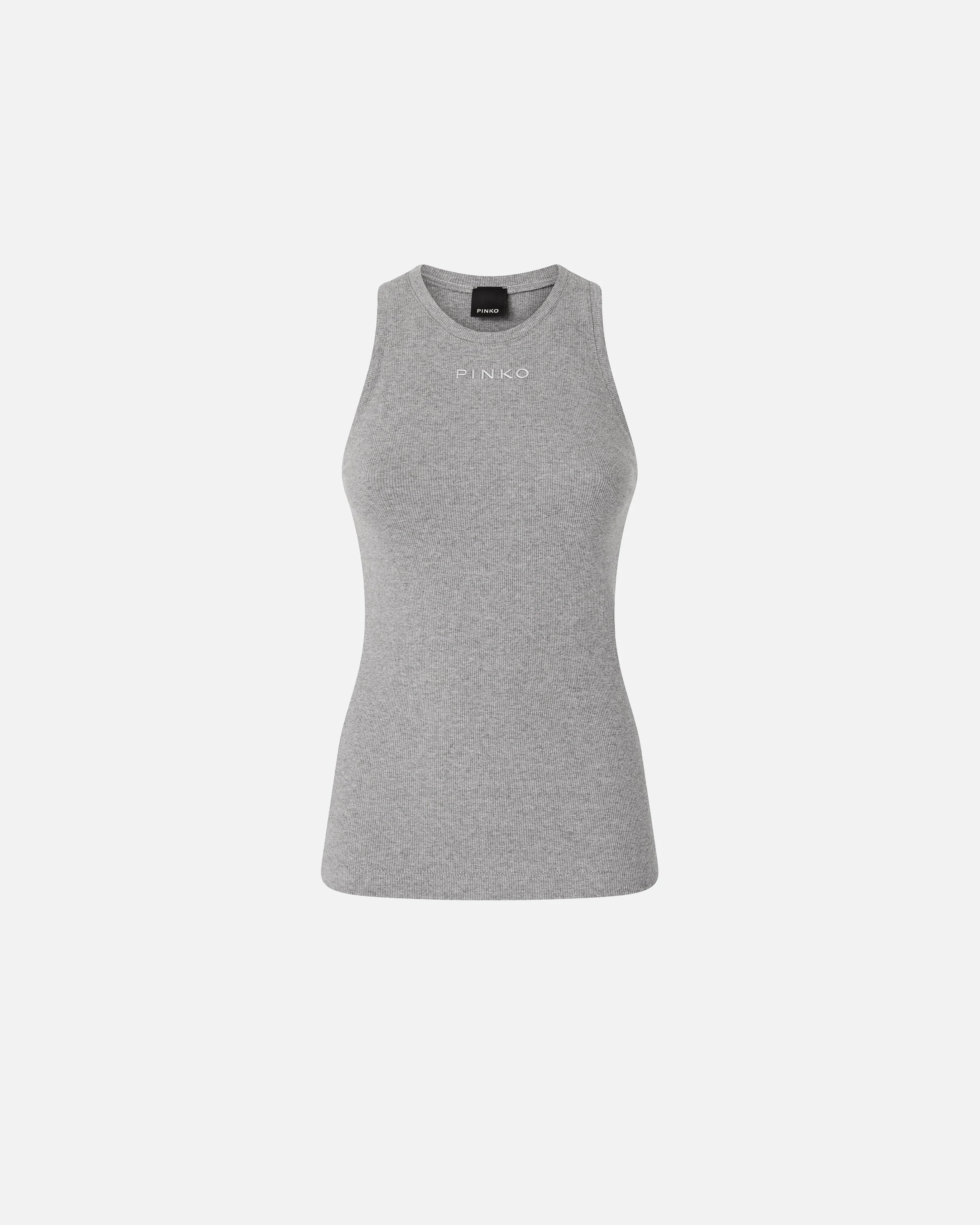 DISTINTO TANK TOP ā 100822A2RCI42 Sleeveless stretch cotton jersey vest top with a racer neck and embroidered PINKO lettering logo on the front. This ribbed vest top is a wardrobe staple, perfect for building everyday spring looks that are functional and feminine at the same time. COMPOSITION Outside Fabric: COTTON 97% ELASTANE 3%