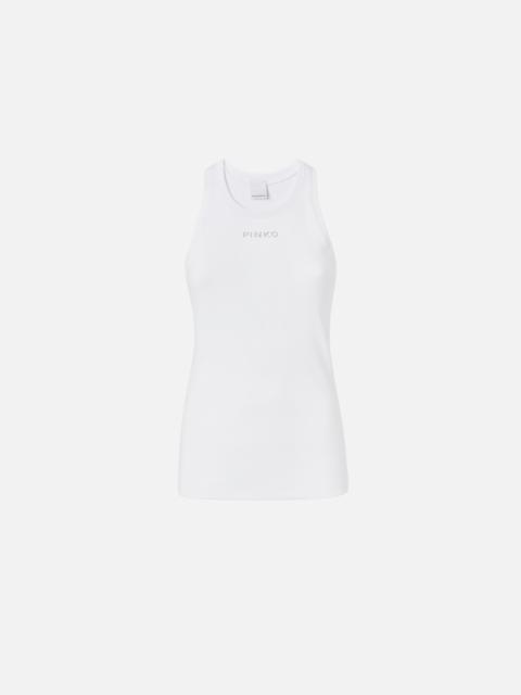 DISTINTO TANK TOP ā 100822A2RCX19 Sleeveless stretch cotton jersey vest top with a racer neck and embroidered PINKO lettering logo on the front. This ribbed vest top is a wardrobe staple, perfect for building everyday spring looks that are functional and feminine at the same time. COMPOSITION Outside Fabric: COTTON 97% ELASTANE 3%