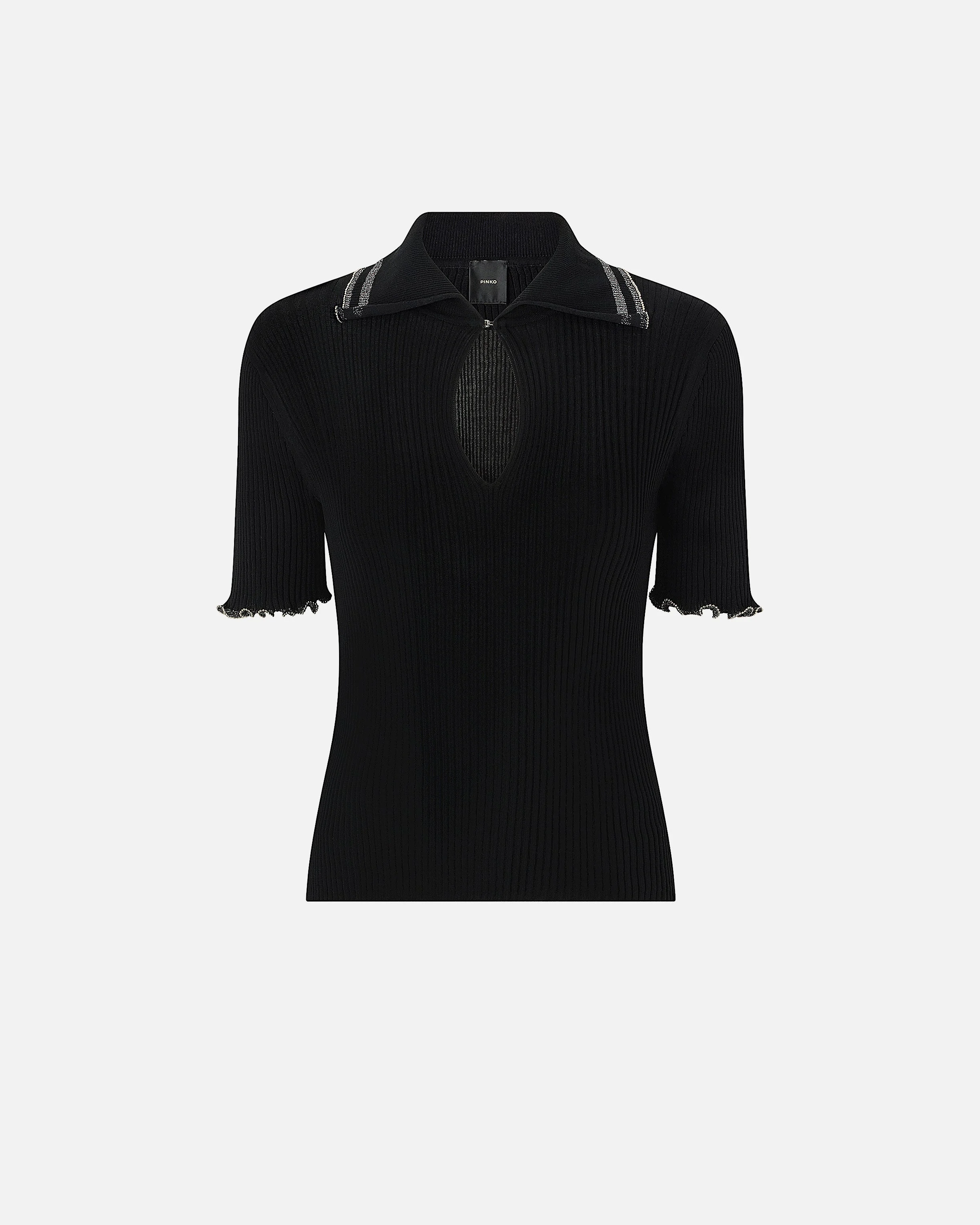 106287A343-Z99 Short-sleeved sweater with polo collar, made from ribbed cotton-blend crepe. Sporting a hook-fastened keyhole neck, this garment features a gathered hem-adorned collar and sleeves, and is embellished with small metallic spheres that create a refined interplay between the matte finish of the fabric and the sheen of the metal. The final touch is given by the label with PINKO logo lettering on the back. Pair this sweater with matching pieces for a comfy-chic head-to-toe leisure look. COMPOSITION 1° Outside Fabric: COTTON 69% POLYAMIDE 31% POLYAMMIDE 31% - 2° Outside Fabric: POLYESTER 62% Metallic fibre 38% Metallised Fibre 38% - : copper 100% COPPER 100% MEASURES W: 0.22 g