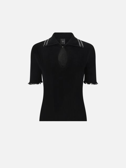 106287A343-C14 Short-sleeved sweater with polo collar, made from ribbed cotton-blend crepe. Sporting a hook-fastened keyhole neck, this garment features a gathered hem-adorned collar and sleeves, and is embellished with small metallic spheres that create a refined interplay between the matte finish of the fabric and the sheen of the metal. The final touch is given by the label with PINKO logo lettering on the back. Pair this sweater with matching pieces for a comfy-chic head-to-toe leisure look. COMPOSITION 1° Outside Fabric: COTTON 69% POLYAMIDE 31% POLYAMMIDE 31% - 2° Outside Fabric: POLYESTER 62% Metallic fibre 38% Metallised Fibre 38% - : copper 100% COPPER 100%