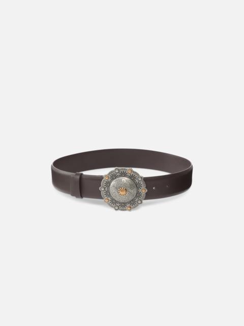 106713A0F1-Z99O 4 cm belt in soft, silky leather. This accessory, ideal for high-waisted wear, features a buckle consisting of a jewelled medallion in Texan style with engraved micro motifs. We all know that details are what make the difference: choose this belt to give your casual looks an original touch. COMPOSITION Leather: COWHIDE 100% BOVINE SKIN 100% - Accessory: Zinc 100% MEASURES H: 4.0 cm L: 84.0 cm