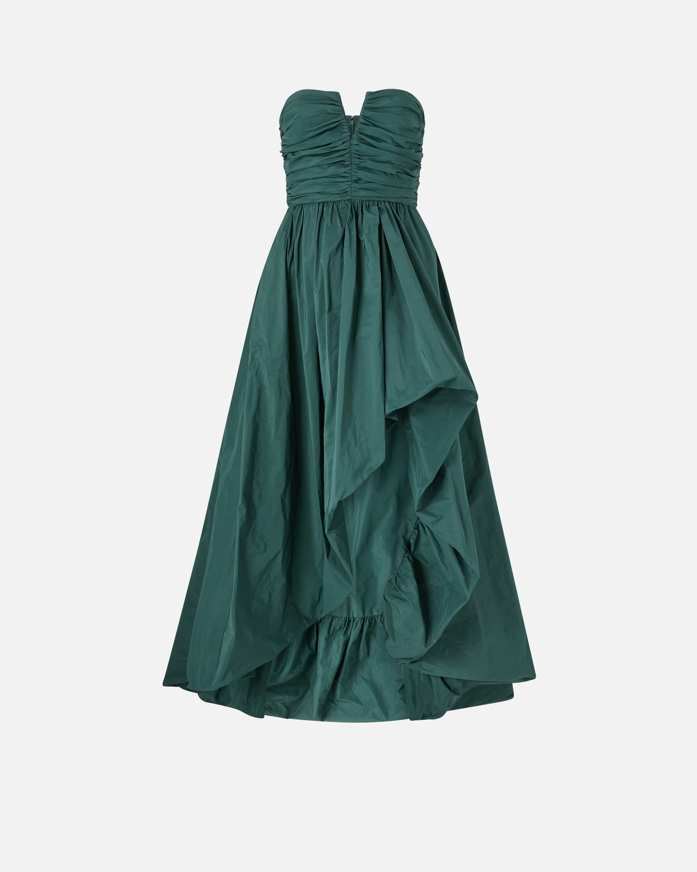 105537Y3LE-V88 Long taffeta dress, fitted on top and flared on the skirt, with a zip on the back and an opening on the front. The material is light and shiny and blends perfectly with the dynamic-volume design that distinguishes the garment. The feminine line of the strapless bodice is enhanced by the shaped neckline and the ruffled detailing, while the inside of the cups has tape to prevent the dress from slipping. This elegant dress is perfect for wearing on special occasions, whether as an evening outfit or as a ceremony look. COMPOSITION Outside Fabric: POLYESTER 100% - Body lining: POLYESTER 90% ELASTANE 10% - Sleeve lining: POLYESTER 100% MEASURES W: 0.85 g