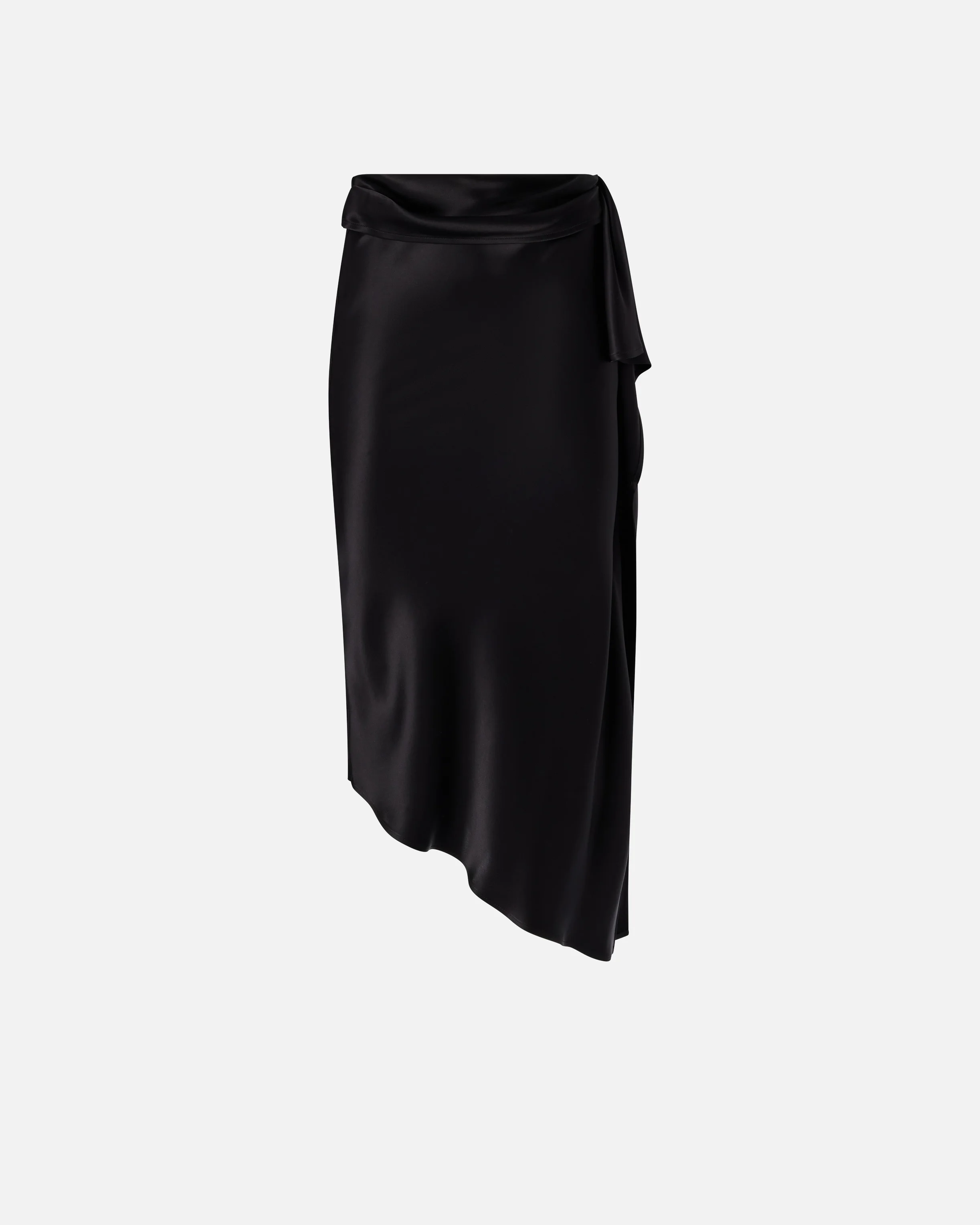 null − 105607A1Y5Z99 Full satin midi skirt with a tie belt on the waist. The shiny satin gives the piece unique shimmer and a particularly soft hand. The asymmetrical cut creates a dramatic effect, which is also accentuated by the flounces on the sides, creating a sensual and striking look. Wear this design for a fluid, slinky effect that elegantly enhances the lines with sophistication and the comfortable, feminine silhouette that is perfect for any occasion. COMPOSITION Outside Fabric: POLYESTER 100%