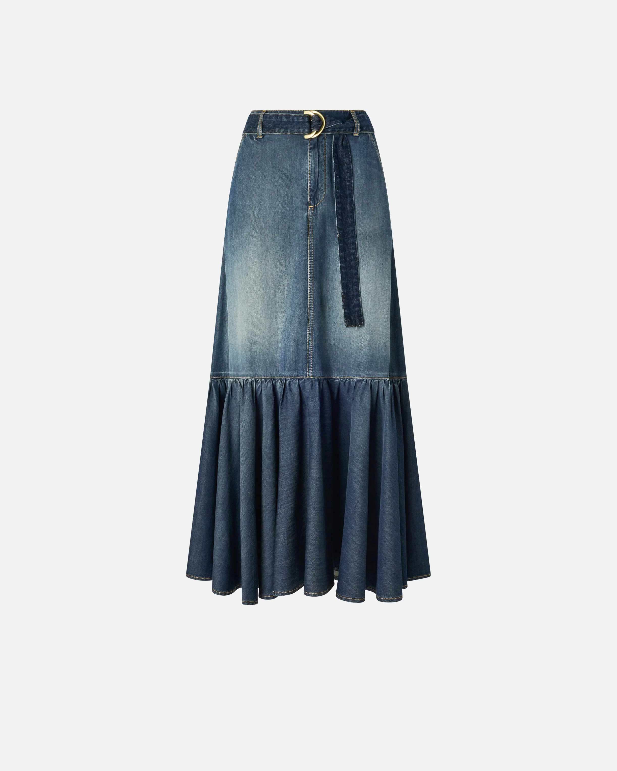 LONG DENIM SKIRT WITH FLOUNCE AND BELT