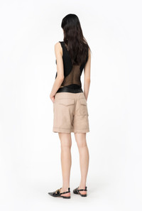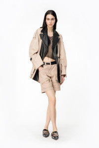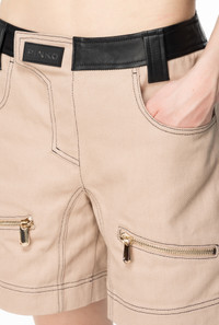 Straight-leg shorts in cotton drill, with leather insert at the waist, belt loops and biker-style detail in the middle at the back. Metal zip at the bottom of the legs on the front, low waist, side pockets and asymmetric rear pockets, one of which is gusseted and has a drawstring. Flap-concealed fastening with logo-branded leather tag. COMPOSITION 1° Outside Fabric: COTTON 100% - 2° Outside Fabric: SHEEP LEATHER 100% SHEEPSKIN LEATHER 100% - Lining: COTTON 100%