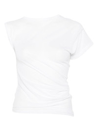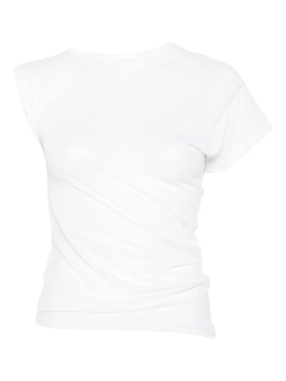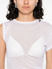 semi-sheer T-shirt Highlights - White - Crew neck - Asymmetric sleeves - Gathered detailing Made in Italy Composition Cotton 70%, Nylon 30% SIZE & FIT Model measurements Height 5 ft 10 in(1.79 m) Bust/Chest 33.07 in(84 cm) Hips 35.82 in(91 cm) Waist 24.01 in(61 cm) FittingInformation Designed for a close fit throughout Made from a lightweight stretch fabric, this piece offers elasticity and flexibility when worn