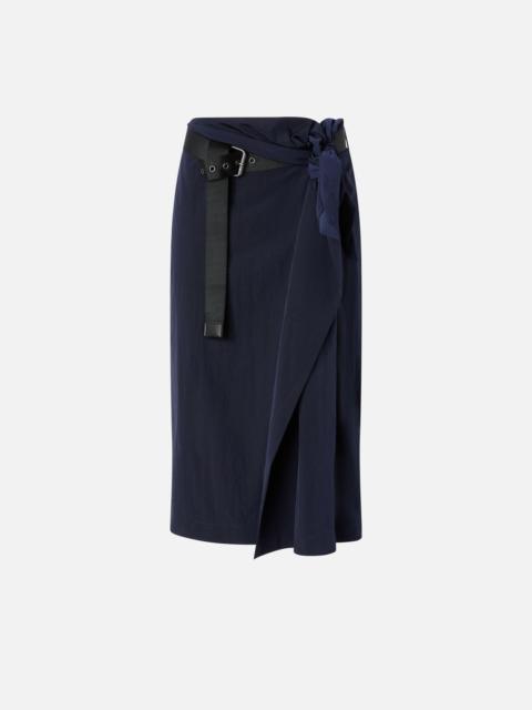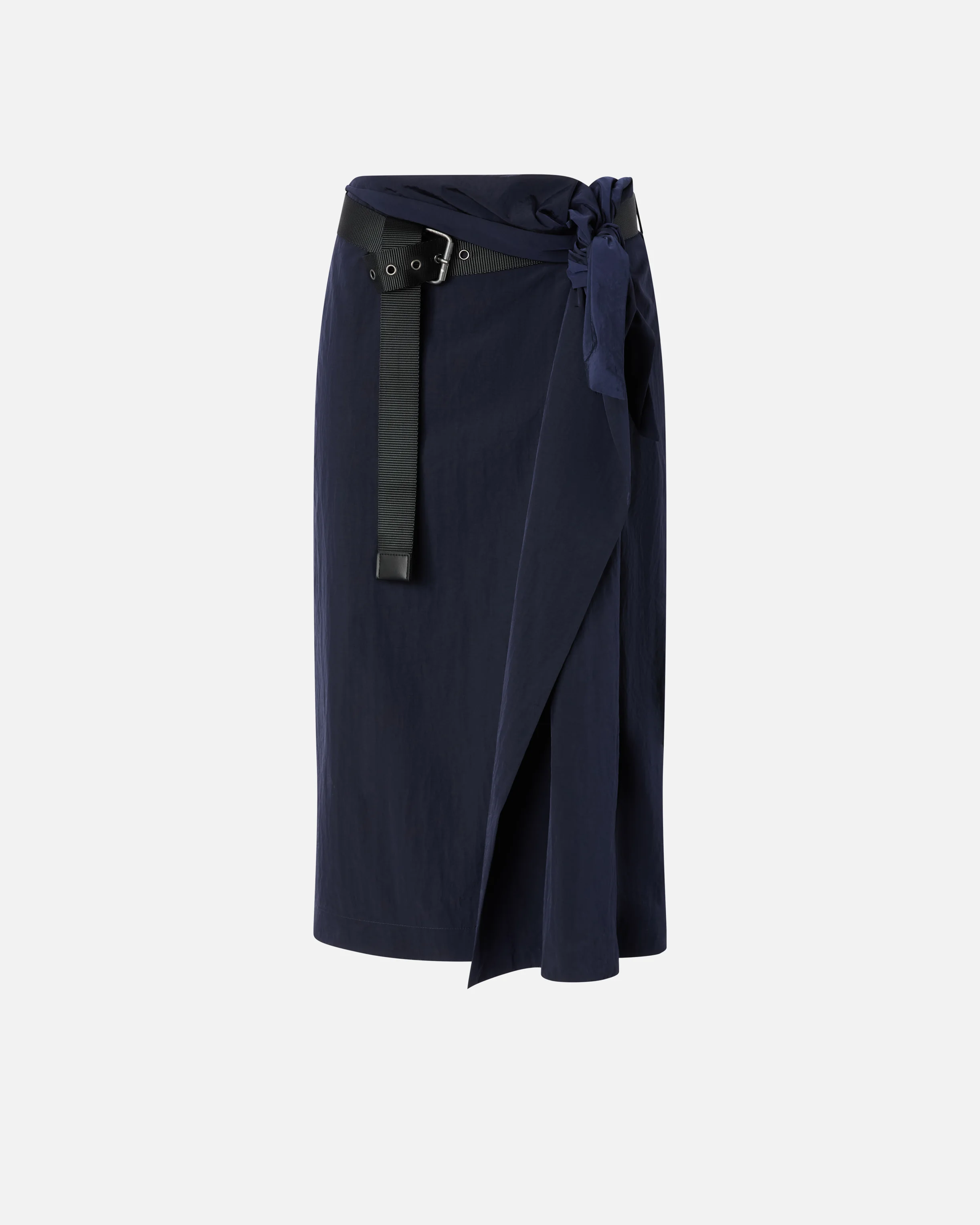 TARTETATIN SKIRT − 106873A3AZG56 Navy blue wallet skirt with an asymmetrical cut, made of light and smooth technical fabric that enhances movement. Side knot closure in coordinated fabric and black belt with metal buckle for a functional and gritty detail. The above-the-knee length and wrap construction give a modern and versatile look. Perfect with an oversized shirt and high boots for a metropolitan outfit with a strong character. COMPOSITION Outside Fabric: POLYAMMIDE 100% POLYAMIDE 100% - Lining: POLYESTER 70% COTTON 30% - Belt: POLYESTER 100%