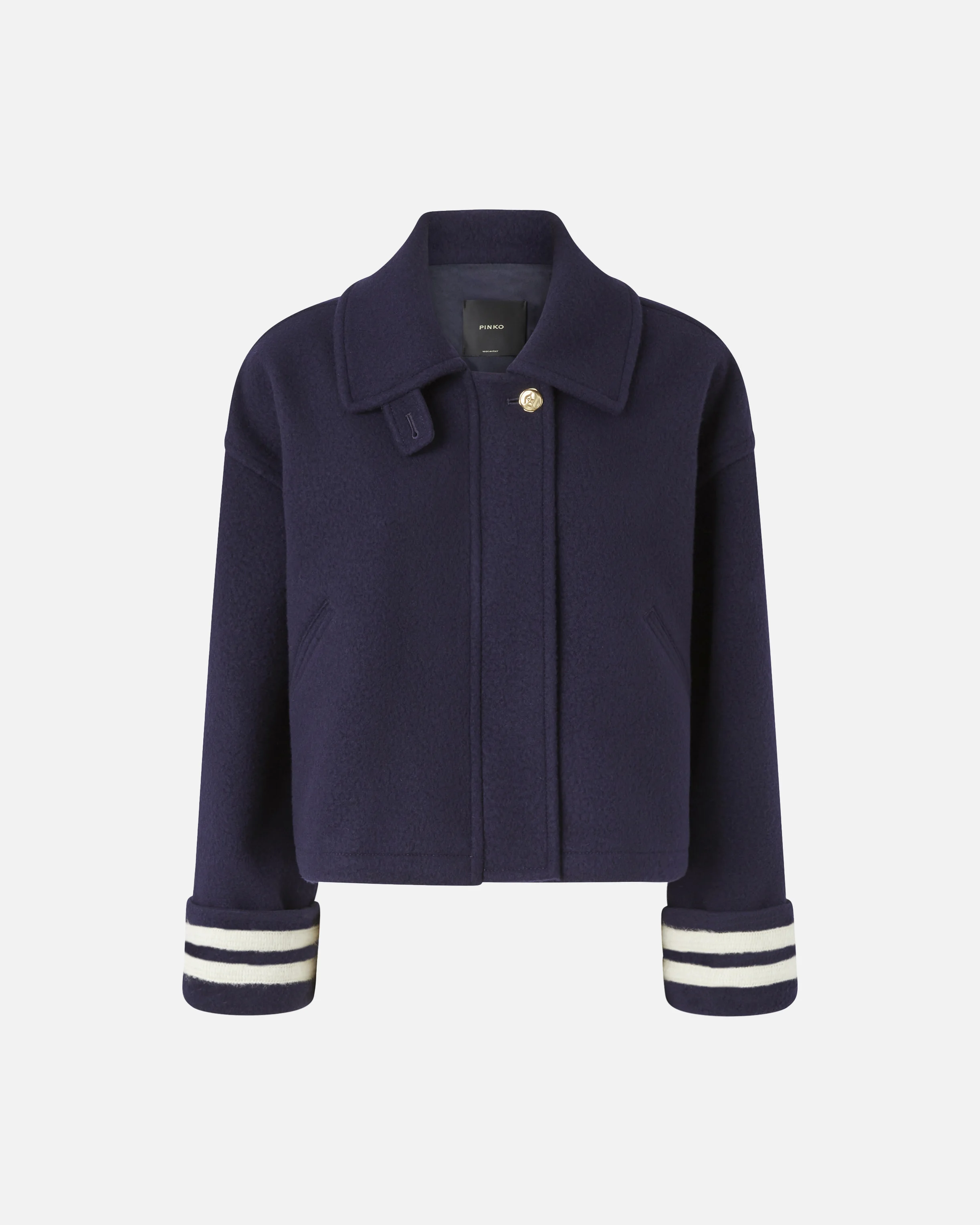 CIAMBELLA CABAN − 105682A2SJG82 Short pea coat with long sleeves and a shirt-style collar with buttonhole. The fabric used is an extra-fine wool cloth with an interesting textured look, similar to boiled wool, obtained by boiling the fabric. This style features a pure PINKO take on the classic pea coat and stands out for the special straps on the wrists in needled mohair that create the typical stripes seen on sailor coats. The concealed fastening with first visible star-decorated button is inspired by the uneven quality of natural mother of pearls. This technical outerwear garment also has an adjustable waist drawstring to tailor the fit and inner lining. COMPOSITION Outside Fabric: WOOL 80% POLYAMMIDE 20% POLYAMIDE 20% - Lining: ACETATE 67% POLYESTER 33%