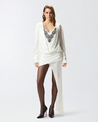 SBUCCIAMELA DRESS − 105660A1Y5ZZ1 Short dress with a train on the side, an invisible side zip and gold-toned sphere button on the sleeves. The shiny satin gives the piece unique shimmer and a particularly soft hand. This piece is complemented by a touch of sensuality provided by the lingerie top with contrasting lace. Wear this design for a fluid, slinky effect that elegantly enhances the lines with sophistication and the feminine silhouette. COMPOSITION Outside Fabric: ACETATE 91% POLYESTER 9% - Lining: POLYESTER 100% - : POLYAMMIDE 100% POLYAMIDE 100%