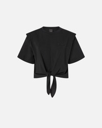 TUCA TUCA T-SHIRT − 105015A2IDZ99 Short-sleeved sweater with a cropped cut, at navel level, in vintage cotton jersey characterized by a knotted detail on the front. The short t-shirt is customized with logo embroidery on the front, on the left side, and with slightly constructed shoulders, with highlighted armholes. The short cut, which leaves a portion of the belly uncovered, together with the knotted detail make this t-shirt the perfect summer garment to celebrate the summer with a light and feminine everyday look. COMPOSITION 1° Outside Fabric: COTTON 100% - 2° Outside Fabric: COTTON 100% - : POLYESTER 100%