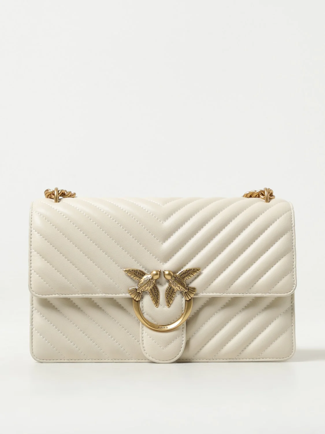 DESCRIPTION - Logo: Love Birds - Lining: With imprinted logo - Model: Shoulder - Closure: With button flap - Shape: Rectangular - Shoulder strap: With leather shoulder rests - Measurements: Shoulder strap length from shoulder: 55 cm - Materials: Matelasse Nappa leather - Pattern: Monogram DETAILS AND CARE Composition 100%HF SIZE AND FIT Sizes Width : 26 cm Height: 15 cm Depth: 7 cm Designer code: 100941A0GK Z14Q Giglio Code: 402483 Designer: Pinko Collection: Pinko Woman Category: Bags Pinko