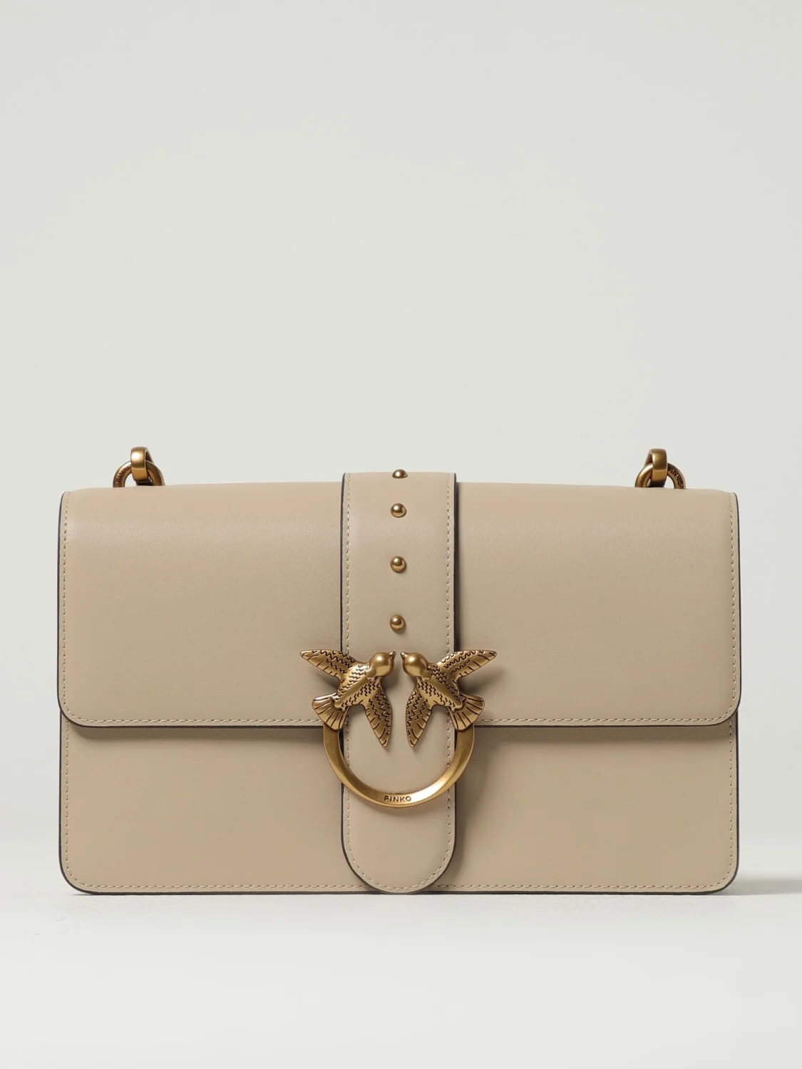 DESCRIPTION - Logo: Love Birds - Details: With studs - Model: Shoulder - Closure: With button flap - Shape: Rectangular - Shoulder strap: Adjustable and removable - Materials: Smooth cowhide - Pattern: undefined DETAILS AND CARE Composition 100 AF SIZE AND FIT Sizes Width : 27 cm Height: 17 cm Depth: 7 cm Designer code: 105857A0F1 C50Q Giglio Code: 433703 Designer: Pinko Collection: Pinko Woman Category: Bags Pinko
