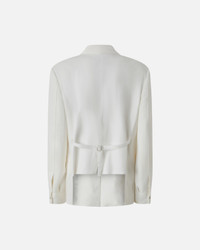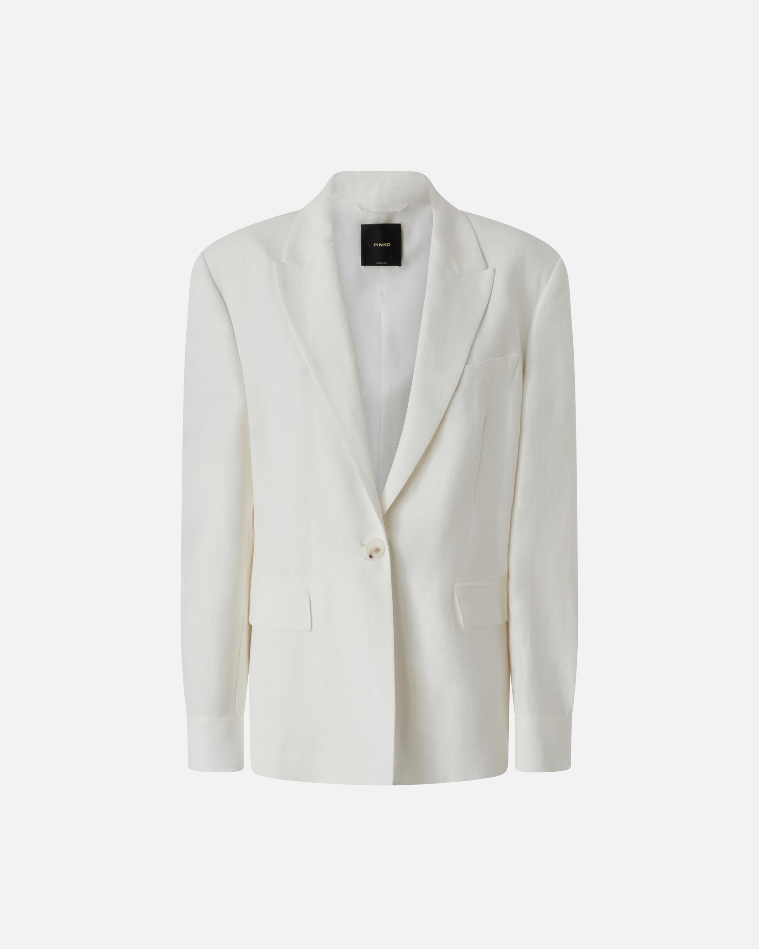 UMBRELLA JACKET − 104944A2FAZ05 Women's single-breasted blazer in stretch viscose and linen blend fabric, with a shorter back, reminiscent of the back of a suit vest, made of viscose twill and completed by an elegant adjustable strap. The jacket features a lapel collar, welt pocket and flap pockets on the sides, and is lined for better comfort while wearing. The single-breasted closure is completed by a single button. The bi-material blazer is made precious by the particular insert on the back, and is perfect with matching trousers to create a summer outfit to show off on special occasions. COMPOSITION 1° Outside Fabric: VISCOSE 73% LINEN 27% - 2° Outside Fabric: VISCOSE 100% - Lining: ACETATE 65% VISCOSE 35%