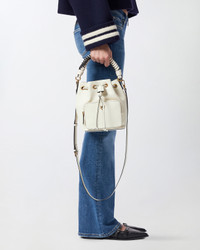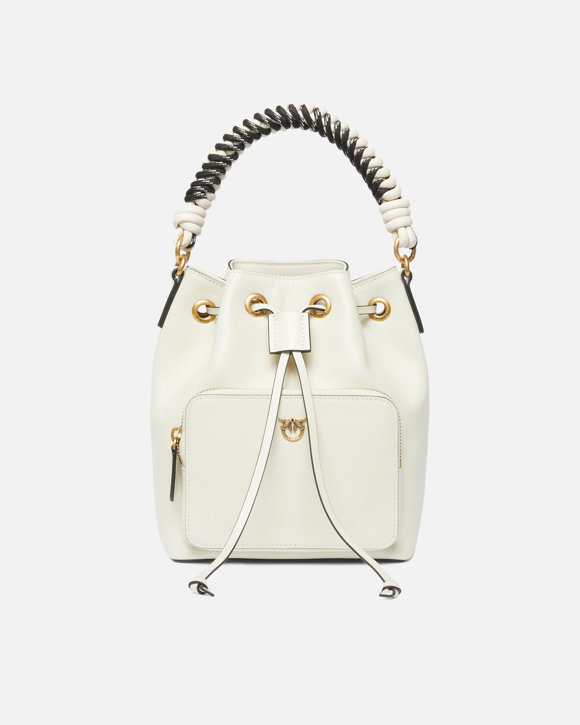 CARGO BUCKET − 105112A2OVZ14Q00001 Small Cargo Bucket Bag in soft leather, complete with a cotton lining. Featuring a removable leather shoulder strap and braided handle so it can be carried by hand or crossbody, the bag is extremely versatile and practical. A distinctive accessory that is perfect for endless looks, this bag has a drawstring to adjust the fastening and an outer zip pocket to keep your essentials safe. The refined design is complemented by the Love Birds logo, which embodies the inimitable style of the brand. Activate your PINKO bag: verify the authenticity of your product and access a personalised experience by scanning the Love Birds embroidery on the back of the bag with your smartphone! COMPOSITION Leather: COWHIDE 100% BOVINE SKIN 100% - Outside Fabric: POLYURETHANE 100% - Lining: COTTON 100% MEASUREMENTS - Height: 22 cm - Width: 15 cm - Length: 19 cm