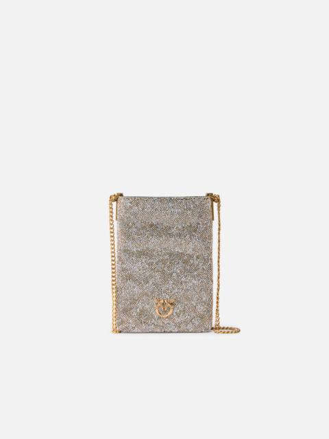 PHONE CASE − 105358A20DZZLQ00001 Elegant phone case characterized by a surface completely covered with rhinestones that create a monogram pattern with a sparkling and precious effect. The rectangular structure with a metallic chain allows it to be worn as a shoulder bag, transforming it into a versatile and glamorous accessory, while the studded finish gives luminosity and refinement to any outfit. The applied crystals form the brand's iconic motif, giving it a distinctive character and luxury appeal, completed by the metallic logo that further embellishes the design. Ideal for those looking for a tech accessory with a strong aesthetic impact, it pairs perfectly with evening looks or casual outfits to add a touch of sophisticated brilliance. COMPOSITION Outside Fabric: Silica 100% SILICON DIOXIDE 100% - Internal: CALF LEATHER 100% CALFSKIN LEATHER 100% - Accessory: Zinc 100% MEASUREMENTS - Height: 17 cm - Width: 3 cm - Length: 12 cm