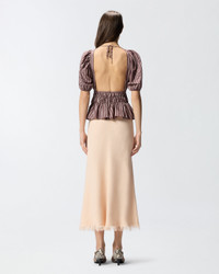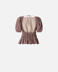 106674A33Q-LN1 Cropped top with a round neck at the front and large puffed sleeves with an elasticated hem. Made from a fluid, yarn-dyed viscose fabric with a vertical striped pattern, the garment is made special by a ruched waistband that gives way to a soft ruffle at the hem, and by the back, featuring ties to fasten behind the neck and a deep square neckline that leaves the back open. The piece is partially lined to provide extra comfort while wearing. With this top, which pairs perfectly with classic high-waisted trousers or a pair of jeans, it is effortless to create a feminine, refined daytime look with a bon ton–inspired feel. COMPOSITION Outside Fabric: VISCOSE 87% POLYAMMIDE 13% POLYAMIDE 13% - Lining: COTTON 100%