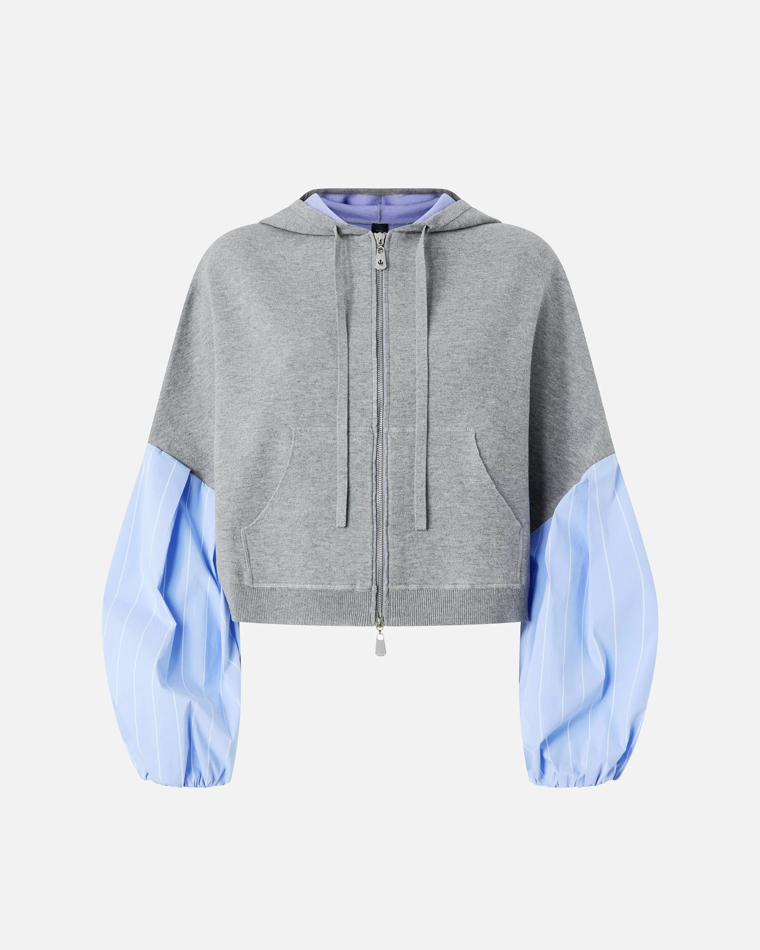 106289A348-IE3 Vanise-knit viscose-blend sweatshirt with contrasting shirt-style insert in striped stretch cotton-blend poplin that complements the sleeves and gives them a balloon-like shape. This model features elasticated sleeve ends, pouch pockets, two-way zip fastening at the front and a drawstring hood finished with a label sporting the iconic PINKO logo on the back. A garment that demonstrates the refined creativity of the brand, ideal for modern looks that combine functionality and style. COMPOSITION Outside Fabric: COTTON 67% POLYAMMIDE 28% POLYAMIDE 28% ELASTANE 5% - Outer Yarn: VISCOSE 70% POLYESTER 30% MEASURES W: 0.65 g