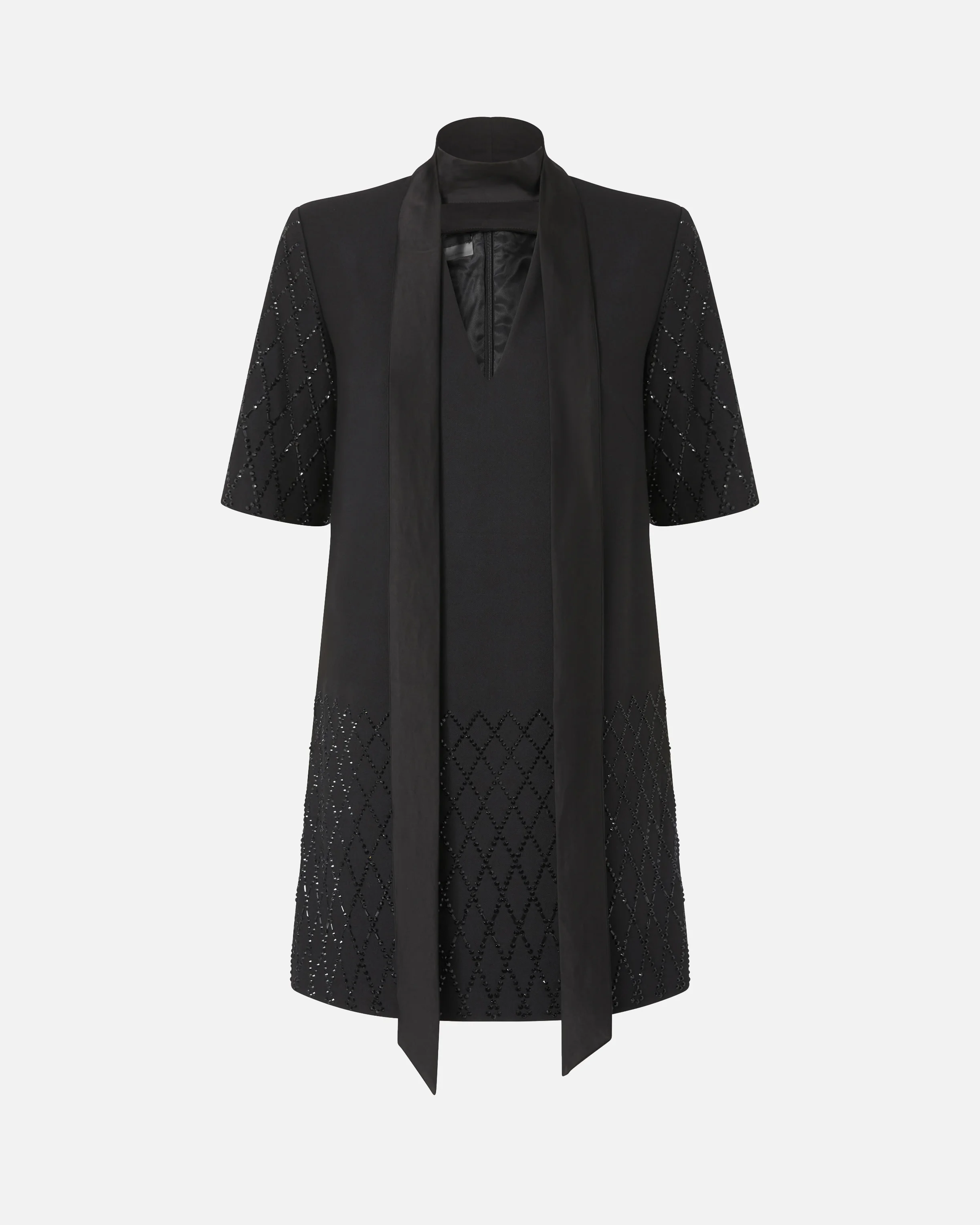 LIPOGRAMMA DRESS − 105523A2POZ99 Loose-fitting, short-sleeved T-shirt-style dress with zip on the back. This dress features rhinestone applique in different shapes and sizes that creates a sophisticated geometric design on the hem and sleeves. The detailing gives the garment a fine, luminous effect that elevates the understated quality of the silhouette. The satin scarf accessory completes the look impeccably. COMPOSITION 1° Outside Fabric: POLYESTER 92% VISCOSE 6% ELASTANE 2% - 2° Outside Fabric: ACETATE 100% - Lining: POLYESTER 55% VISCOSE 45% - : Glass 100%