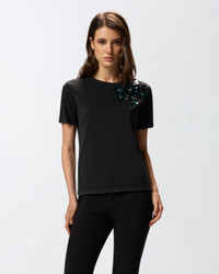 DOMINGA T-SHIRT − 106030A2ZLZ98 Short-sleeved, relaxed-fit crew-neck T-shirt made from 100% cotton jersey. This item is embellished with small crystals and patent-effect sequins of various sizes, embroidered by hand and arranged to form jewel flowers on the shoulder. Team this item with jeans from your wardrobe: all it takes is one detail to make even the most casual outfits shine. COMPOSITION Outside Fabric: COTTON 100% - : POLYESTER 100% - : Glass 100% - : Brass 100% brass 100%