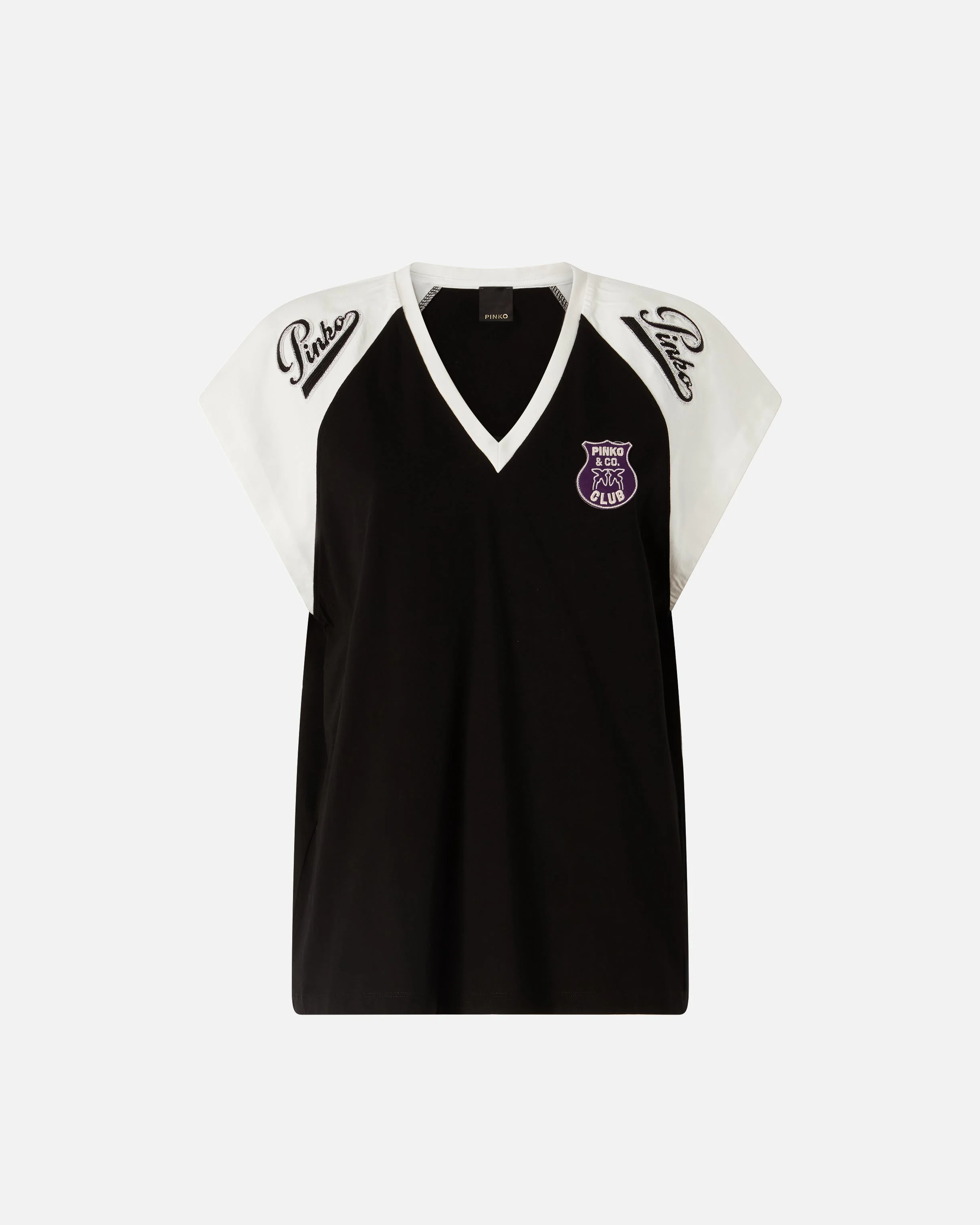 106932A3CC-ZDG V-neck T-shirt in cotton jersey, with low set-in cap sleeves made from contrasting twill. The model offers a nod to the baseball kits of the '90s and is customised with numerous branded details, including a shield on the front left side, embroidered patches with PINKO logo lettering on the shoulders, two rubberised prints flanked by raised thread embroideries on the back and a sequin-embellished maxi PINKO Soul embroidery—also on the back—for a shiny touch. - SALINA T-SHIRT COMPOSITION 1° Outside Fabric: COTTON 100% - 2° Outside Fabric: VISCOSE 92% POLYESTER 8% - 3° Outside Fabric: COTTON 95% ELASTANE 5% - : POLYESTER 100% - : POLYESTER 65% COTTON 35% MEASURES W: 0.25 g