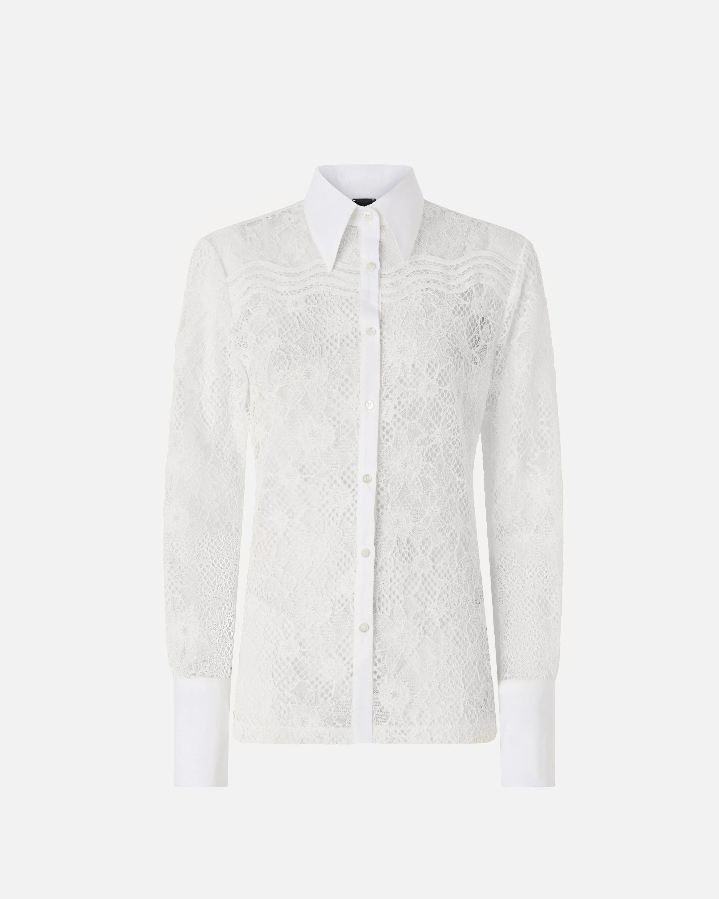 106600A381-Z05 Classic shirt with long sleeves, long cuff and button, straight hem and a visible front button placket. Crafted from an ultra-sheer, lightweight tulle base, the design is entirely decorated with an intricate mix of different types of lace, each with its own distinctive character: rebrode lace stands out for its raised, textured effect, the finer, lighter Chantilly lace finishes the trims, and the macrame lace enriches the wavy appliques on the upper section. The result is a shirt with a three-dimensional, graphic look that still retains a hint of sheer sensuality: wear it for special occasions or evening looks with a pair of tailored trousers, or try it with jeans for a refined contrasting effect. - COLINE SHIRT COMPOSITION 1° Outside Fabric: POLYESTER 100% - 2° Outside Fabric: COTTON 100% - Accessory 1: COTTON 90% POLYESTER 10% - Accessory 2: POLYAMMIDE 100% POLYAMIDE 100% MEASURES W: 0.34 g