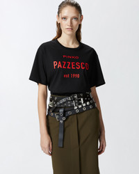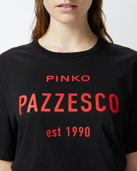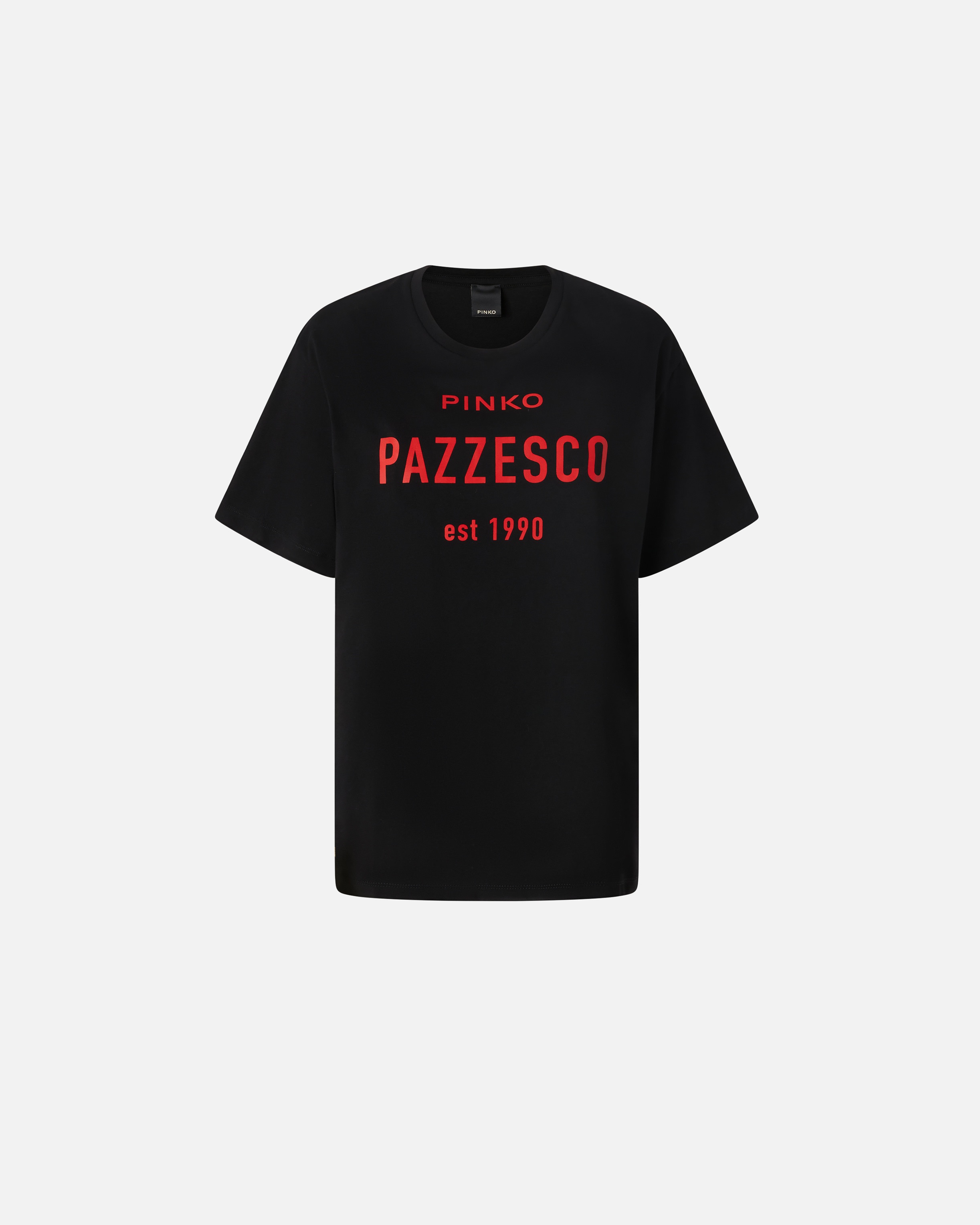 PAZZESCO 1 T-SHIRT − 105027A2OWZ99 Short-sleeved cotton jersey T-shirt with PINKO Pazzesco print. While inspired by classic '90s concert tops, this T-shirt features the slogans of the PINKO Pazzesco project—printed in contrasting colour on the back—in place of the typical concert dates. COMPOSITION Outside Fabric: COTTON 100%