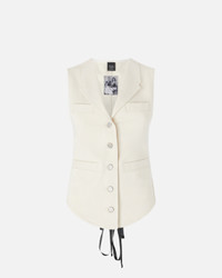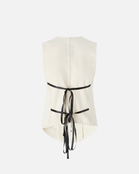 GALICENO GILET − 105072A2JOC21 Cotton drill fabric vest featuring stitching that outlines the silhouette and black ribbons to fasten on the back that add a feminine touch to a typical piece of the male wardrobe. The fitted waistcoat is completed by a small V-neck with lapels, four welt pockets on the front and a metal tack button closure. The vest with bows at the back easily matches your favorite pants or skirts creating a daytime look that stands out for its special details. The garment is part of the special Reimagine PINKO Spring Summer 2025 capsule collection, created with designer Patrick McDowell, who has always paid particular attention to the choice of materials used in his collections in order to reduce their overall environmental impact. COMPOSITION Outside Fabric: COTTON 100% - Lining: POLYESTER 65% COTTON 35% - : POLYESTER 100%