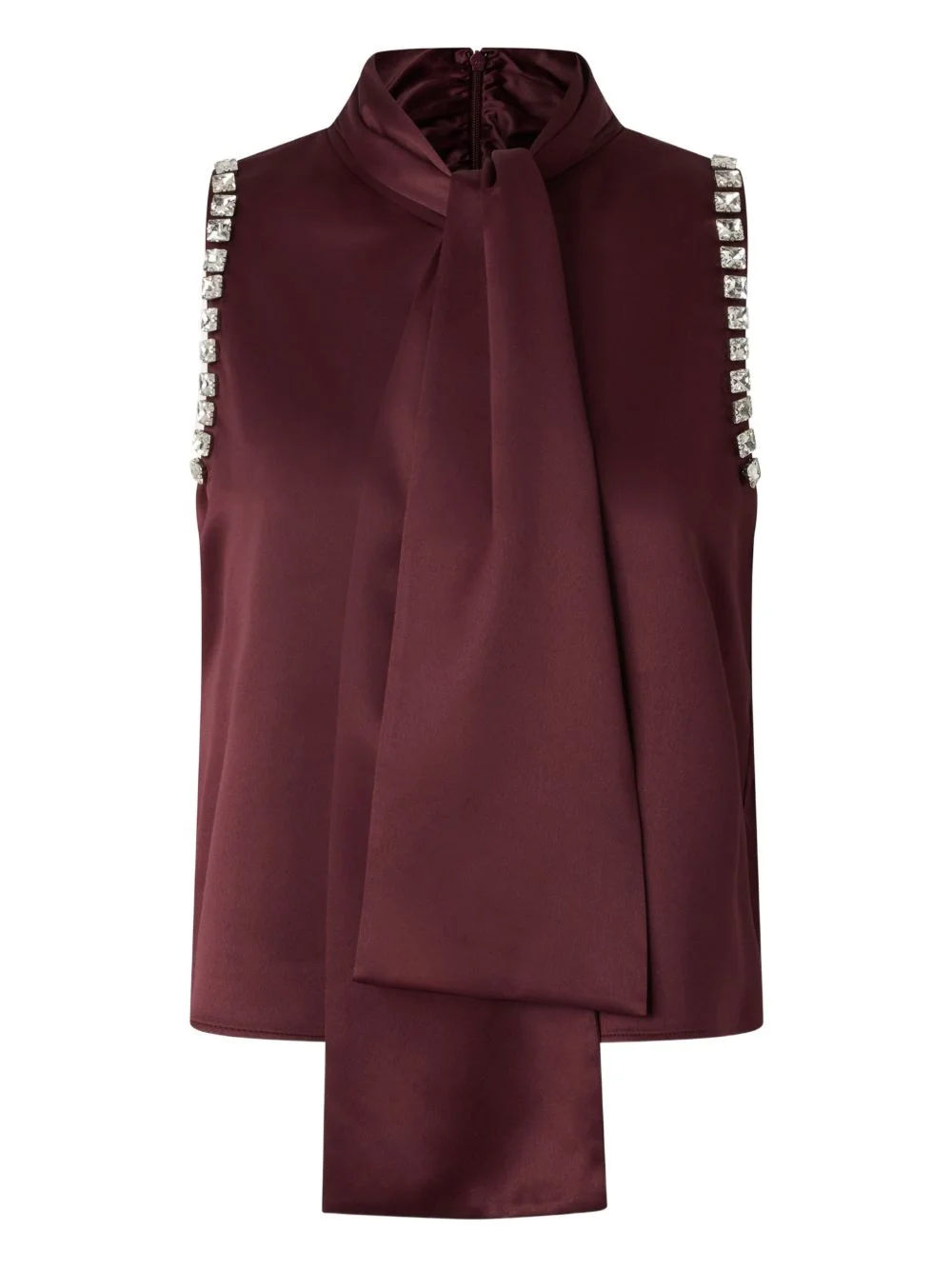 tie-neck satin blouse Highlights - Wine red - Tie neck - Sleeveless - Rear zip fastening Imported Composition Polyester 100% Washing instructions Read Manufacturer Guidelines