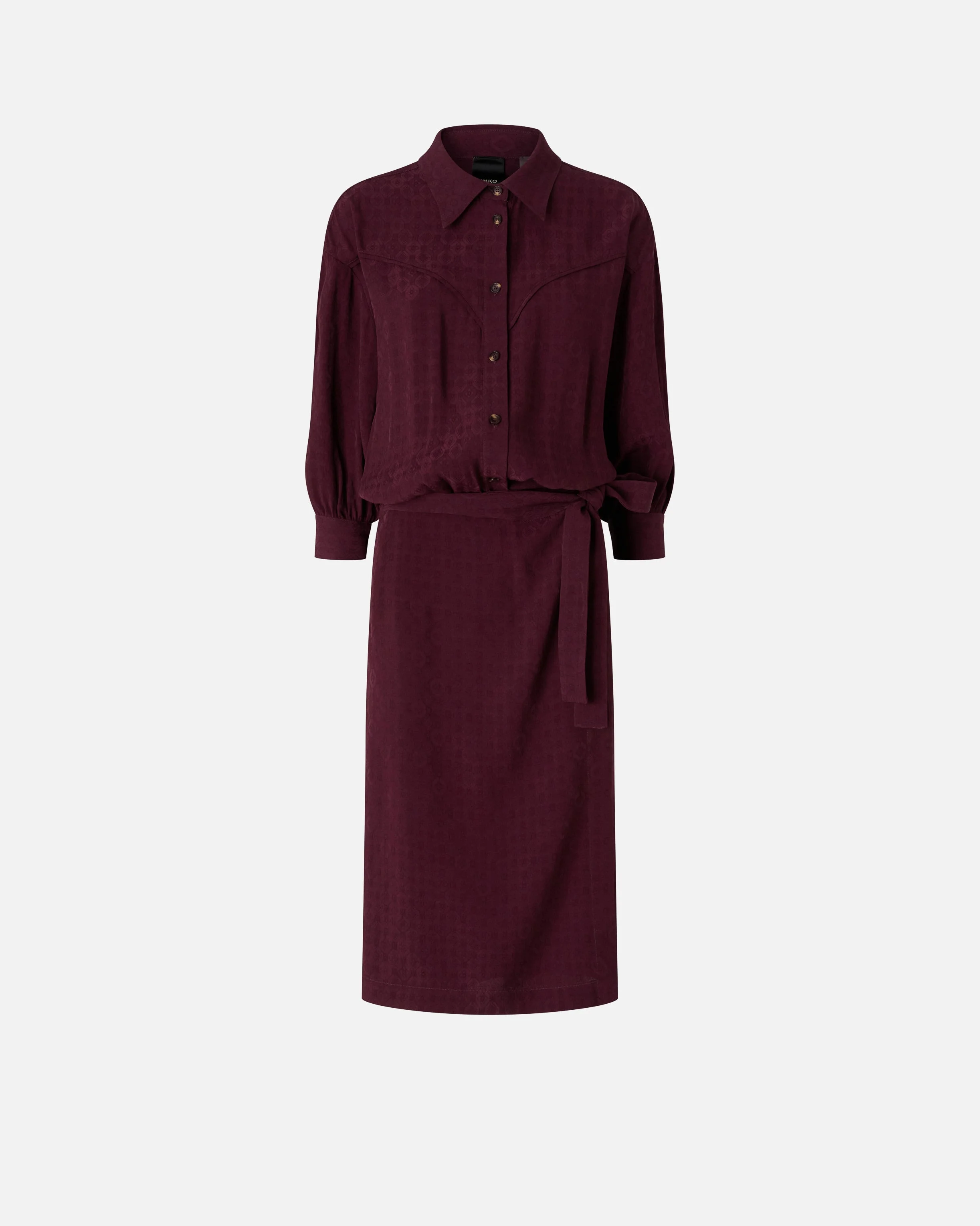 106281A33H-RR7 Midi dress in flowing viscose fabric, ideal to follow the silhouette without constricting it, customised with an all-over tone-on-tone jacquard tie-inspired pattern. The style has a softer upper part, featuring a shirt design with classic collar, three-quarter sleeves with button at the hem, front button placket, pointed front yoke and a yoke with central gathers. The skirt, meanwhile, stands out for its slimmer cut and wrap closure complete with integrated belt to be tied with a bow at one side. Thanks to its versatility, this dress lends itself to being worn on different occasions: just change your shoes and accessories to adapt it to more formal events or casual evenings in company. - ALAINA DRESS COMPOSITION Outside Fabric: VISCOSE 100% - Lining: VISCOSE 100% MEASURES W: 0.63 g