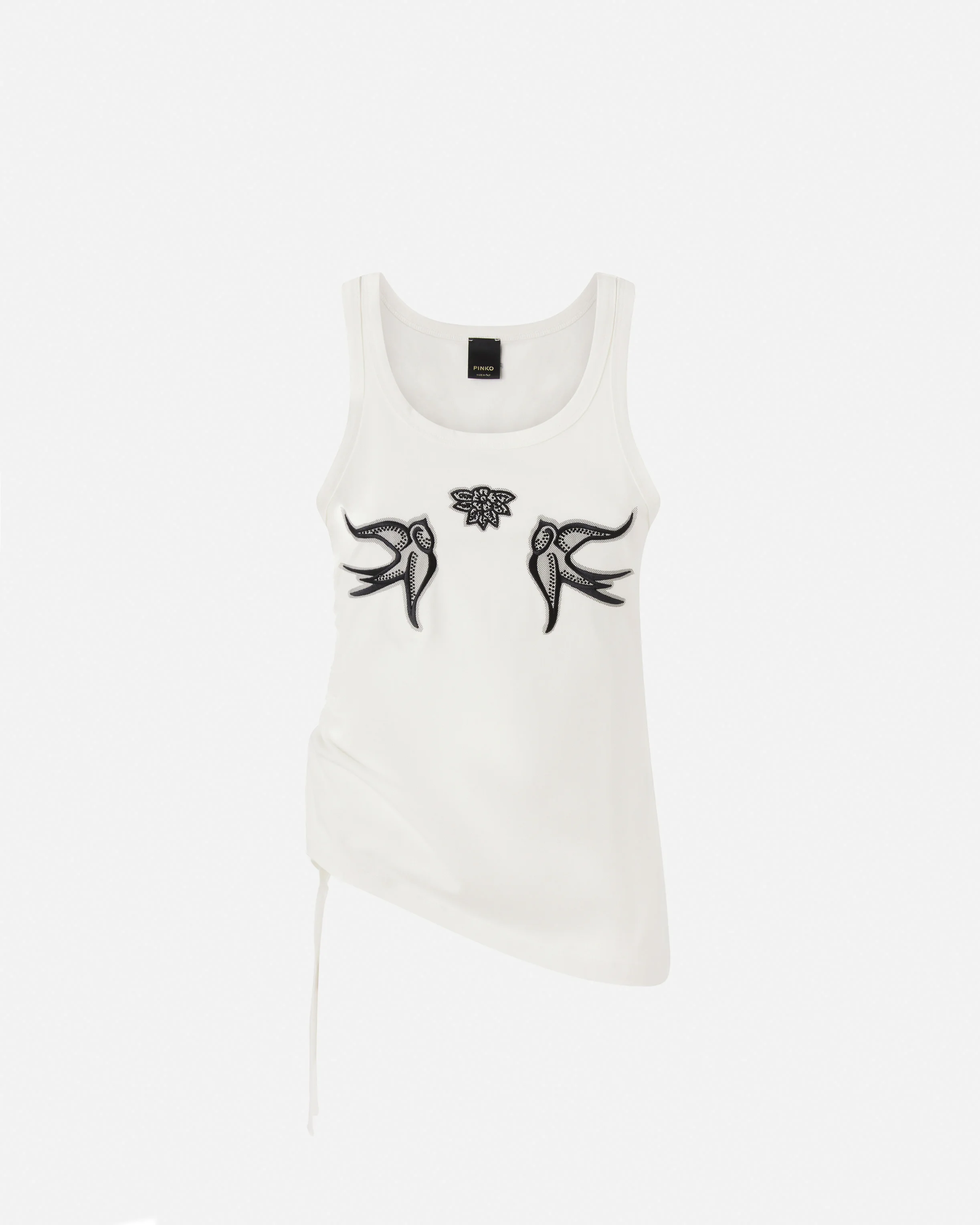 CROCCHETTA TANK TOP ā 105557A2SFZ05 Vest top made from cotton jersey and defined by a deep round-neck. The front is distinguished by embroidery with micro-mesh applique depicting the Love Birds logo. The asymmetrical hem adjusted by a drawstring gives the garment an extra touch of originality. Wear this style with your favourite jeans for a casual and contemporary look. COMPOSITION Outside Fabric: COTTON 100% - : POLYESTER 100% - : Glass 100%