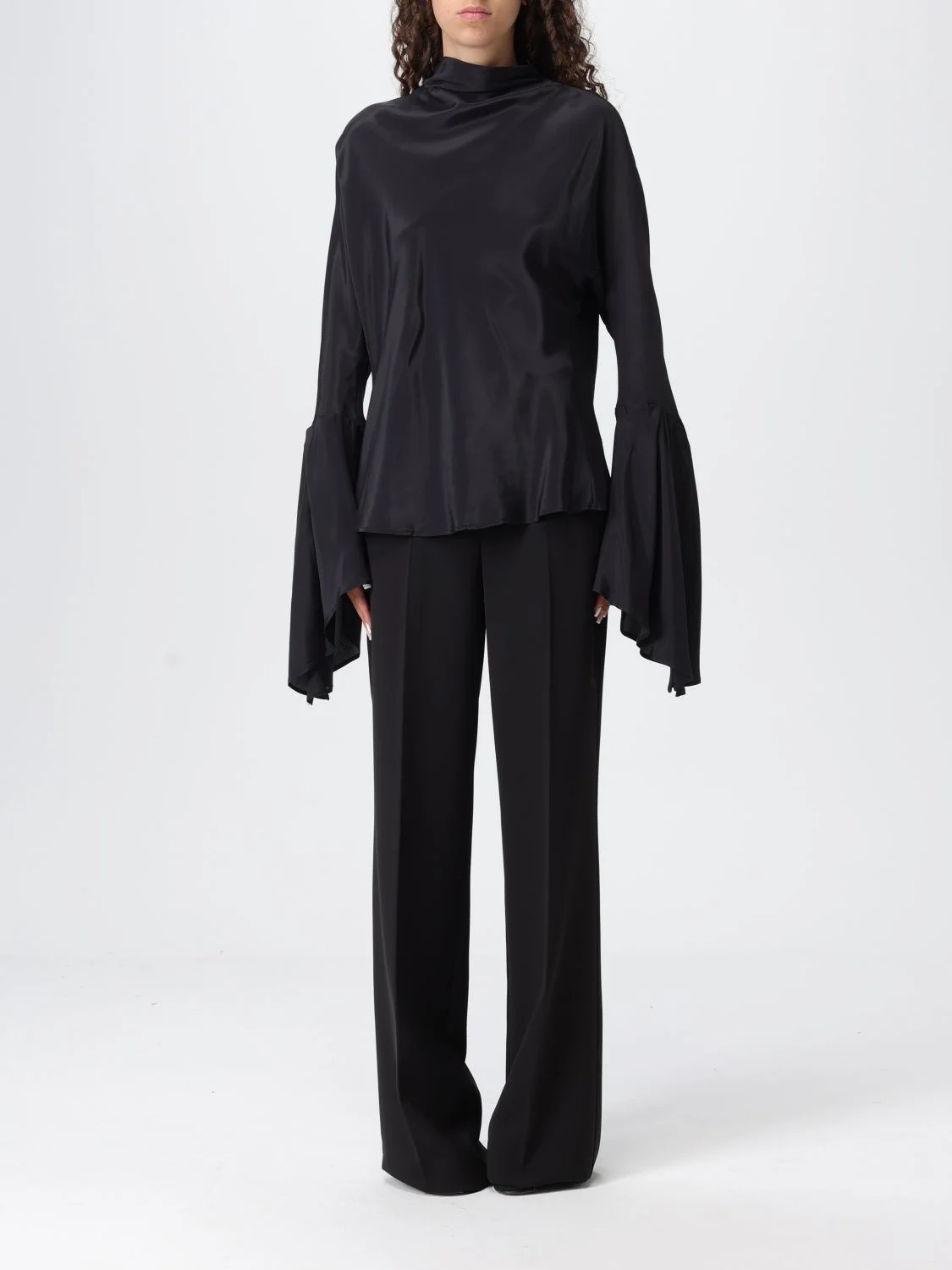 DESCRIPTION - Style: Contemporary - Neck: High - Neckline: Back V neckline - Shoulders: Regular - Bottom: With straight hemline - Sleeves: Long sleeve tops - Materials: Crepe de Chine - Pattern: Plain-colored DETAILS AND CARE Composition | SIZE AND FIT Sizes not available Size and fit Regular fit Designer code: 105625A2S9 Z99 Giglio Code: H27282 Designer: Pinko Collection: Pinko Woman Category: Clothing Pinko