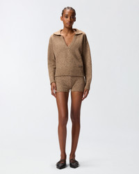 NIBANI POLO − 105684A2U4C3Z V-neck sweater with a polo-style collar and long sleeves made from soft knop jacquard fabric, embellished with shiny rhinestone applique all over. The hem and cuffs are ribbed, while the tone-on-tone label with the PINKO lettering logo stands out on the side of the front. The piece has undergone finishing tests to minimise the possible formation of pilling, ensuring greater fabric softness and durability. The sweater is casual, thanks to the relaxed fit, and at the same time feminine, thanks to the rhinestones that enhance the design. COMPOSITION Outer Yarn: WOOL 60% POLYAMMIDE 20% POLYAMIDE 20% VISCOSE 20% - : Glass 100%